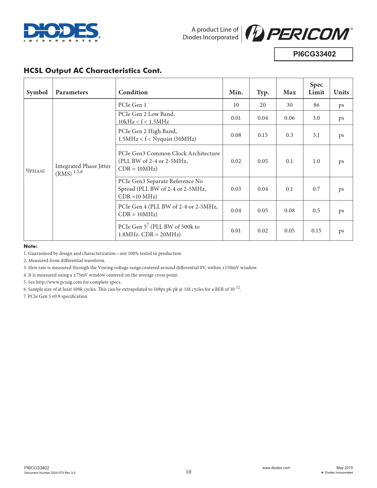 PI6CG33402 HCSL Output AC Characteristics Cont Spec Symbol Parameters Condition Min Typ Max Limit Units Note: