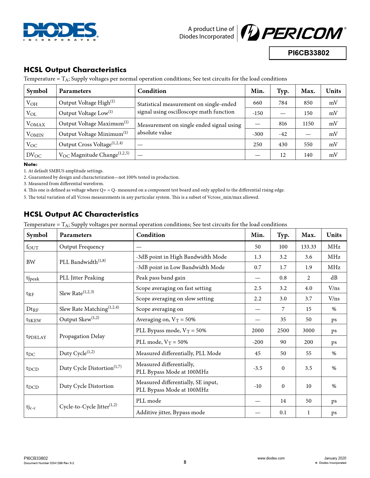 PI6CB33802. HCSL Output Characteristics. Symbol. Parameters. Condition. Min. Typ. Max. Units. Note:. HCSL Output AC Characteristics