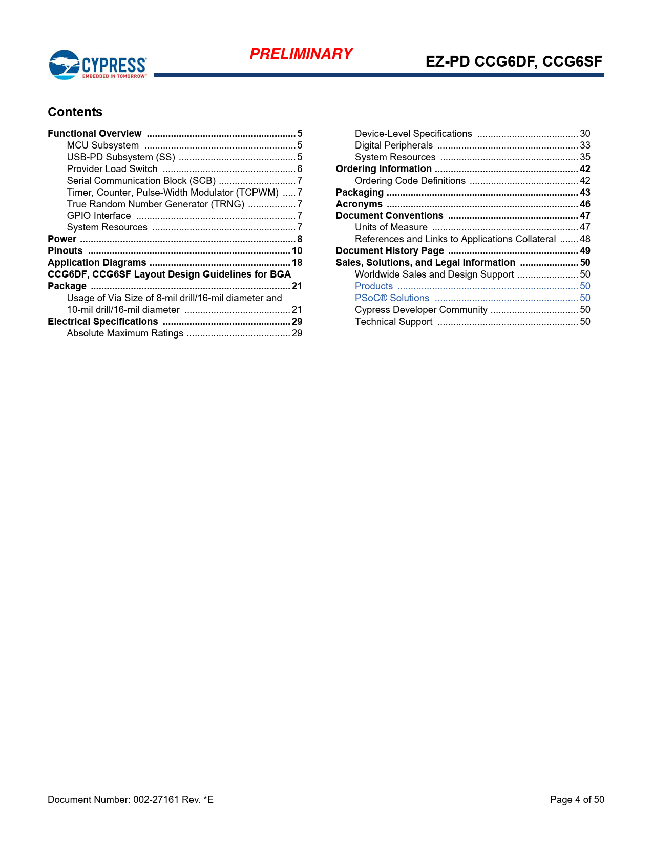 | Páginas / Página | 50 / 4 — PRELIMINARY EZ-PD CCG6DF, CCG6SF Contents. Functional Overview . 5. MCU … |