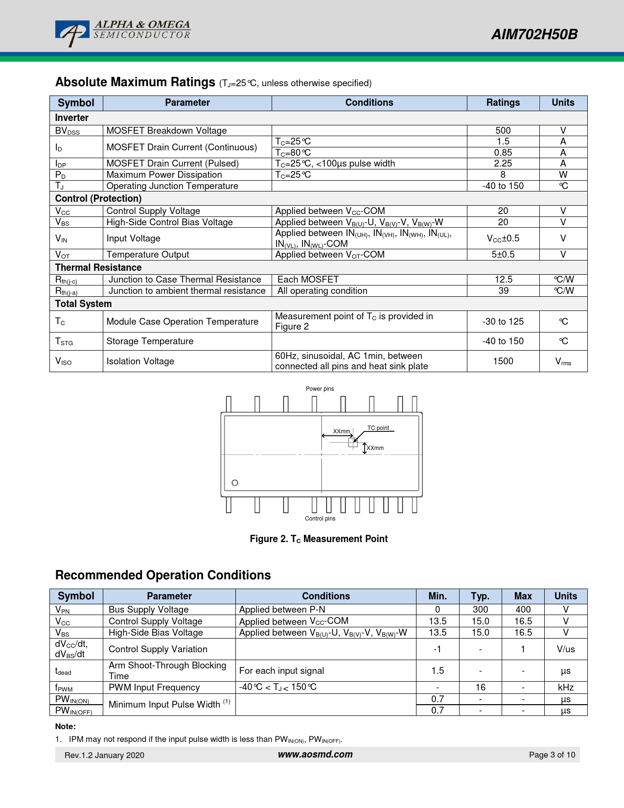 AIM702H50BAbsolute Maximum Ratings (TJ=25°C, unless otherwise specified) SymbolParameterConditionsRatingsUnitsInverter BVDSS MOSFET Breakdown Voltage 500 V T I C=25°C 1.5 A D MOSFET Drain Current (Continuous) TC=80°C 0.85 A IDP MOSFET Drain Current (Pulsed) TC=25°C, <100µs pulse width 2.25 A PD Maximum Power Dissipation TC=25°C 8 W TJ Operating Junction Temperature -40 to 150 °C Control (Protection) VCC Control Supply Voltage Applied between VCC-COM 20 V VBS High-Side Control Bias Voltage Applied between VB(U)-U, VB(V)-V, VB(W)-W 20 V Applied between IN V (UH), IN(VH), IN(WH), IN(UL), IN Input Voltage V IN CC±0.5 V (VL), IN(WL)-COM VOT Temperature Output Applied between VOT-COM 5±0.5 V Thermal Resistance Rth(j-c) Junction to Case Thermal Resistance Each MOSFET 12.5 °C/W Rth(j-a) Junction to ambient thermal resistance All operating condition 39 °C/W Total System Measurement point of T T C is provided in C Module Case Operation Temperature -30 to 125 °C Figure 2 TSTG Storage Temperature -40 to 150 °C 60Hz, sinusoidal, AC 1min, between VISO Isolation Voltage 1500 V connected all pins and heat sink plate rms Power pins TC point XXmm XXmm Control pins Figure 2. TC Measurement PointRecommended Operation ConditionsSymbolParameterConditionsMin.Typ.MaxUnits VPN Bus Supply Voltage Applied between P-N 0 300 400 V VCC Control Supply Voltage Applied between VCC-COM 13.5 15.0 16.5 V VBS High-Side Bias Voltage Applied between VB(U)-U, VB(V)-V, VB(W)-W 13.5 15.0 16.5 V dVCC/dt, Control Supply Variation -1 - 1 V/us dVBS/dt Arm Shoot-Through Blocking tdead For each input signal 1.5 - - µs Time fPWM PWM Input Frequency -40°C < TJ < 150°C - 16 - kHz PWIN(ON) 0.7 - - µs Minimum Input Pulse Width (1) PWIN(OFF) 0.7 - - µs Note: 1. IPM may not respond if the input pulse width is less than PWIN(ON), PWIN(OFF). Rev.1.2 January 2020 www.aosmd.com Page 3 of 10