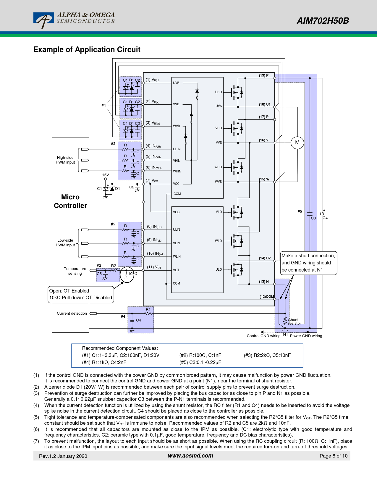 AIM702H50B. Example of Application Circuit. (19) P. (18) U1. (17) P. (16) V. (15) W. Micro. Controller. (14) U2. (13) N. (12)COM. www.aosmd.com