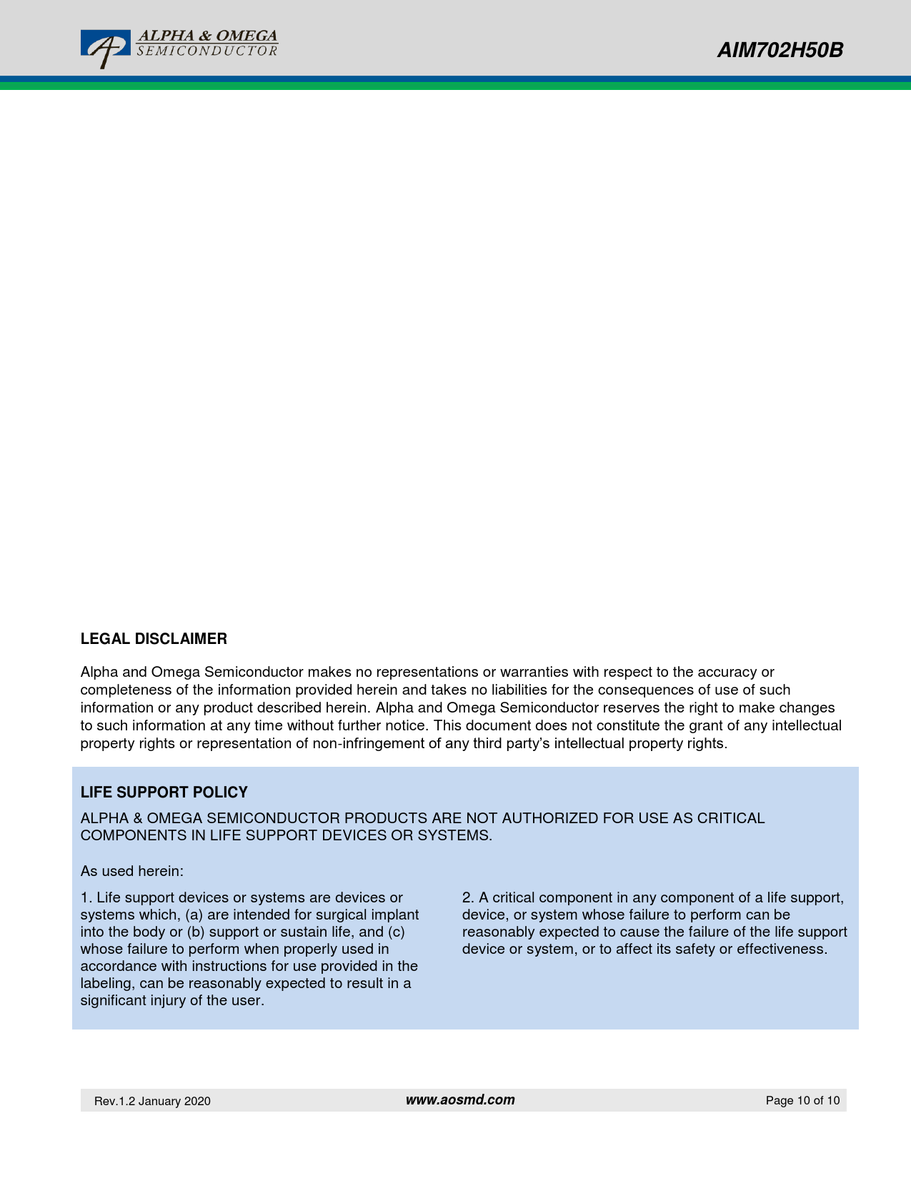 AIM702H50B. LEGAL DISCLAIMER. LIFE SUPPORT POLICY. www.aosmd.com