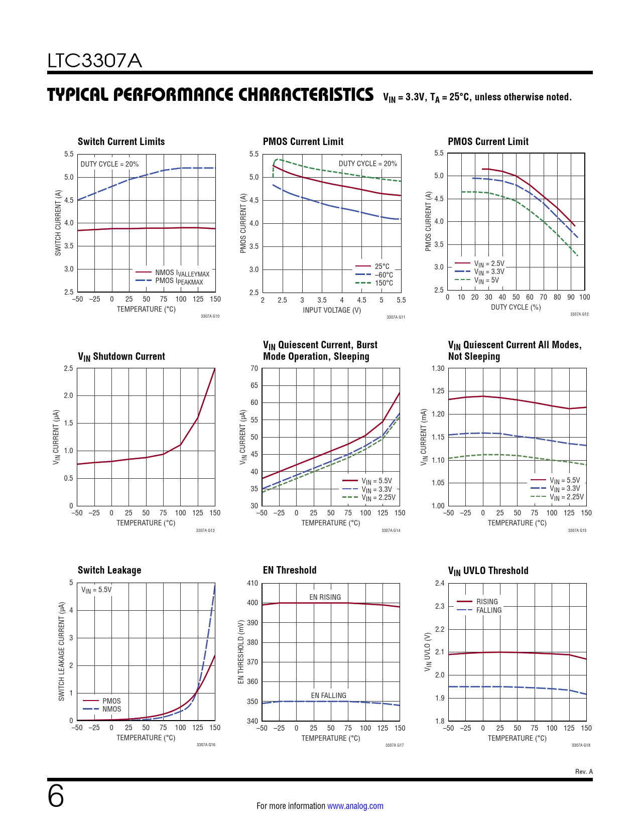 5.5 5.5 5.5 DUTY CYCLE = 20% DUTY CYCLE = 20% 5.0 5.0 5.0 4.5 4.5 4.5 4.0 4.0 4.0 3.5 3.5 3.5 PMOS CURRENT (A) PMOS CURRENT (A) SWITCH CURRENT (A) VIN = 2.5V 25°C 3.0 3.0 3.0 NMOS I V VALLEYMAX IN = 3.3V –60°C PMOS I V PEAKMAX IN = 5V 150°C 2.5 2.5 2.5 0 10 20 30 40 50 60 70 80 90 100 –50 –25 0 25 50 75 100 125 150 2 2.5 3 3.5 4 4.5 5 5.5 DUTY CYCLE (%) TEMPERATURE (°C) INPUT VOLTAGE (V) 3307A G12 3307A G10 3307A G11