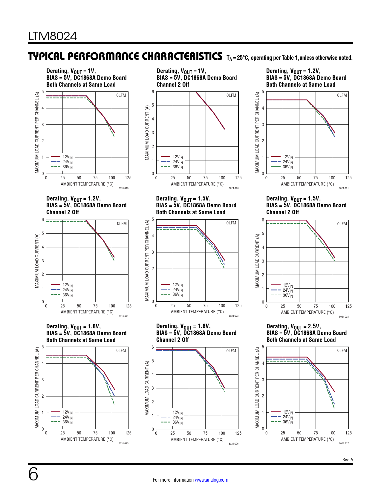 6 5 6 0LFM 0LFM 0LFM 5 4 5 4 4 3 3 3 2 2 2 12V MAXIMUM LOAD CURRENT (A) IN 1 12V 12V 1 IN MAXIMUM LOAD CURRENT (A) IN 24V 1 IN 24VIN 24VIN 36VIN 36VIN 36VIN 0 MAXIMUM LOAD CURRENT PER CHANNEL (A) 0 0 0 25 50 75 100 125 0 25 50 75 100 125 0 25 50 75 100 125 AMBIENT TEMPERATURE (°C) AMBIENT TEMPERATURE (°C) AMBIENT TEMPERATURE (°C) 8024 G22 8024 G23 8024 G24