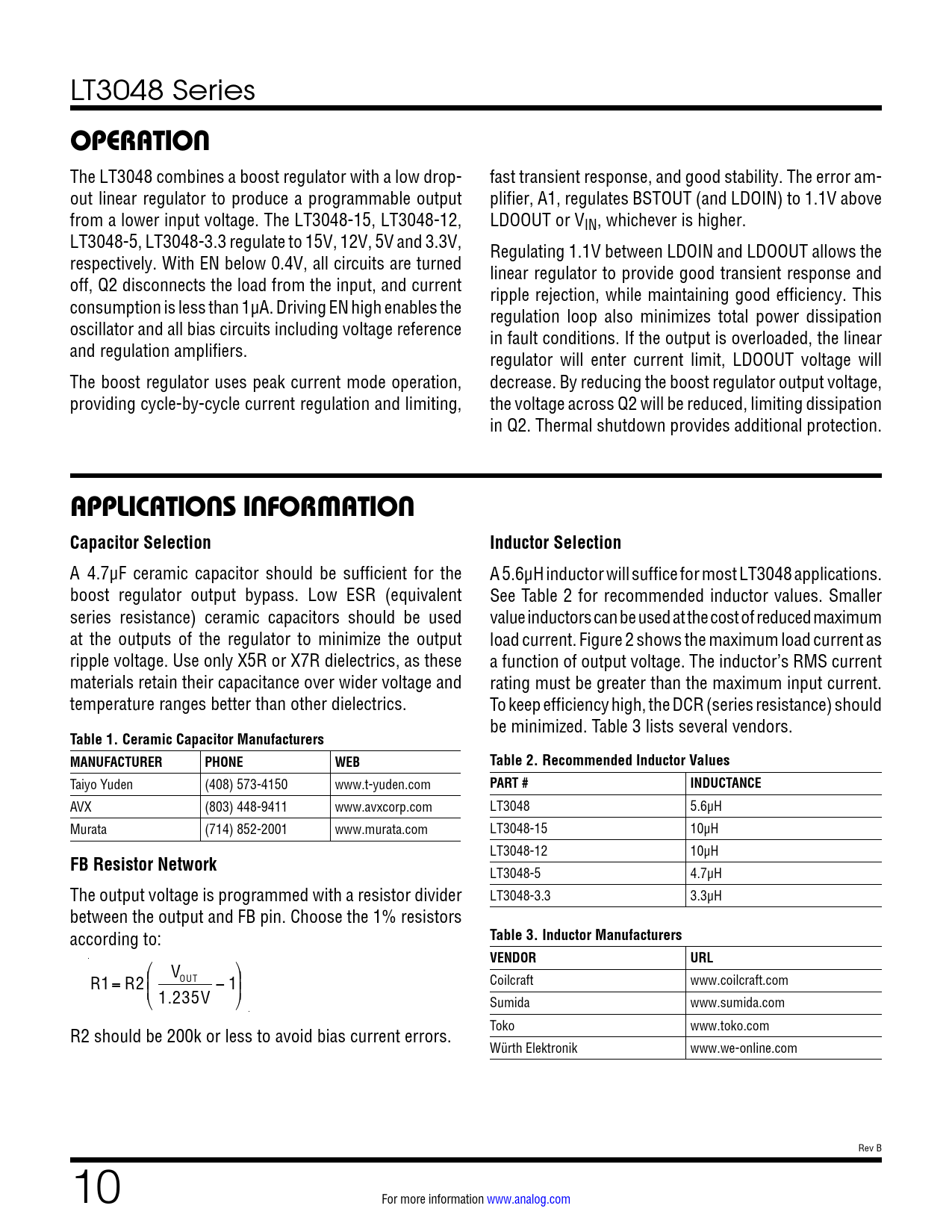 LT3048 Series OPERATION The LT3048 combines a boost regulator with a low drop- fast transient response, and good stability. The error am- out linear regulator to produce a programmable output plifier, A1, regulates BSTOUT (and LDOIN) to 1.1V above from a lower input voltage. The LT3048-15, LT3048-12, LDOOUT or VIN, whichever is higher. LT3048-5, LT3048-3.3 regulate to 15V, 12V, 5V and 3.3V, Regulating 1.1V between LDOIN and LDOOUT allows the respectively. With EN below 0.4V, all circuits are turned linear regulator to provide good transient response and off, Q2 disconnects the load from the input, and current ripple rejection, while maintaining good efficiency. This consumption is less than 1µA. Driving EN high enables the regulation loop also minimizes total power dissipation oscillator and all bias circuits including voltage reference in fault conditions. If the output is overloaded, the linear and regulation amplifiers. regulator will enter current limit, LDOOUT voltage will The boost regulator uses peak current mode operation, decrease. By reducing the boost regulator output voltage, providing cycle-by-cycle current regulation and limiting, the voltage across Q2 will be reduced, limiting dissipation in Q2. Thermal shutdown provides additional protection. APPLICATIONS INFORMATION Capacitor SelectionInductor Selection A 4.7μF ceramic capacitor should be sufficient for the A 5.6μH inductor will suffice for most LT3048 applications. boost regulator output bypass. Low ESR (equivalent See Table 2 for recommended inductor values. Smaller series resistance) ceramic capacitors should be used value inductors can be used at the cost of reduced maximum at the outputs of the regulator to minimize the output load current. Figure 2 shows the maximum load current as ripple voltage. Use only X5R or X7R dielectrics, as these a function of output voltage. The inductor’s RMS current materials retain their capacitance over wider voltage and rating must be greater than the maximum input current. temperature ranges better than other dielectrics. To keep efficiency high, the DCR (series resistance) should be minimized. Table 3 lists several vendors. Table 1. Ceramic Capacitor Manufacturers MANUFACTURERPHONEWEBTable 2. Recommended Inductor Values Taiyo Yuden (408) 573-4150 www.t-yuden.com PART #INDUCTANCE AVX (803) 448-9411 www.avxcorp.com LT3048 5.6μH Murata (714) 852-2001 www.murata.com LT3048-15 10μH LT3048-12 10μH FB Resistor Network LT3048-5 4.7μH The output voltage is programmed with a resistor divider LT3048-3.3 3.3μH between the output and FB pin. Choose the 1% resistors according to: Table 3. Inductor Manufacturers VENDORURL ⎛ V ⎞ R1= R2 OUT ⎜ − 1⎟ Coilcraft www.coilcraft.com ⎜ ⎟ 1.235V ⎝ ⎠ Sumida www.sumida.com R2 should be 200k or less to avoid bias current errors. Toko www.toko.com Würth Elektronik www.we-online.com Rev B 10 For more information www.analog.com Document Outline Features Applications Typical Application Description Absolute Maximum Ratings Pin Configuration Order Information Electrical Characteristics Typical Performance Characteristics Pin Functions LT3048 LT3048-xx LT3048 Block Diagrams Operation Applications Information Package Description Revision History Related Parts