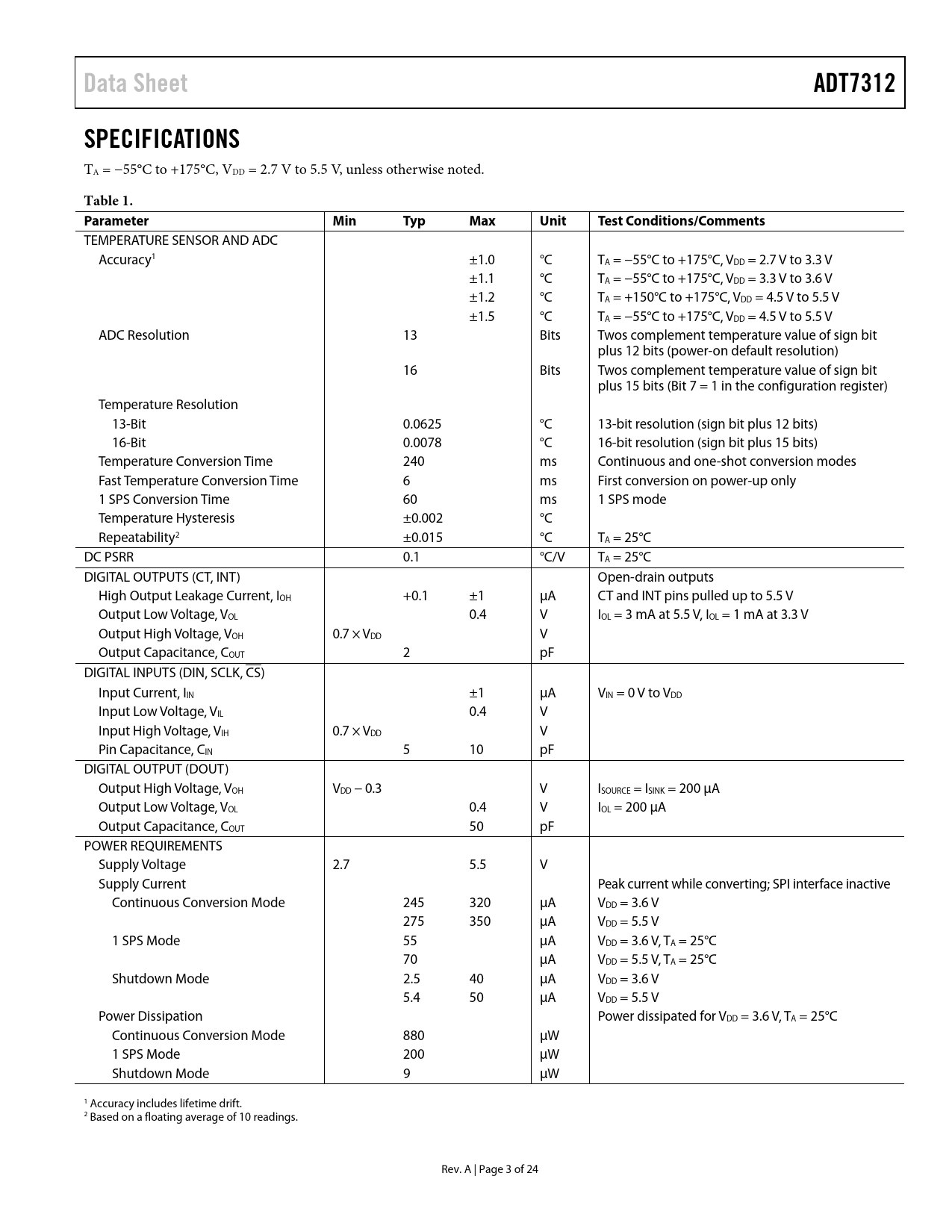 Data Sheet ADT7312 SPECIFICATIONS Table 1 Parameter Min Typ Max Unit Test Conditions/Comments