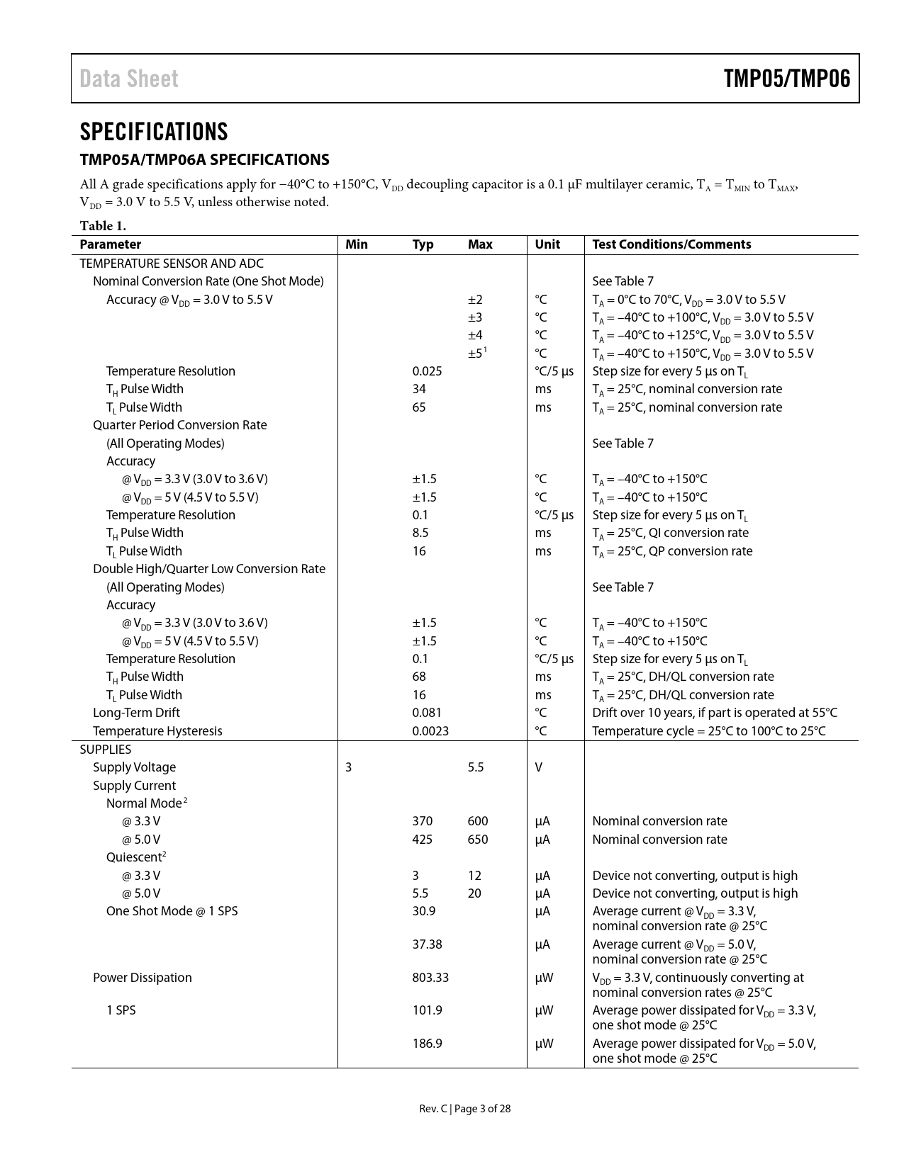 Data Sheet. TMP05/TMP06. SPECIFICATIONS TMP05A/TMP06A SPECIFICATIONS. Table 1. Parameter. Min. Typ. Max. Unit. Test Conditions/Comments