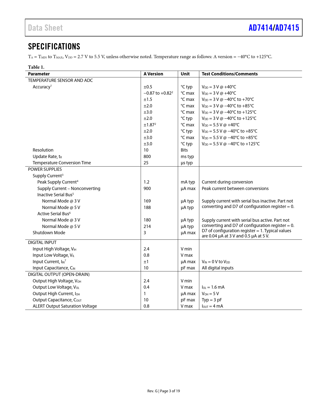Páginas / Página19 / 3 — Data Sheet. AD7414/. AD7415. SPECIFICATIONS. Table 1. Parameter A. …