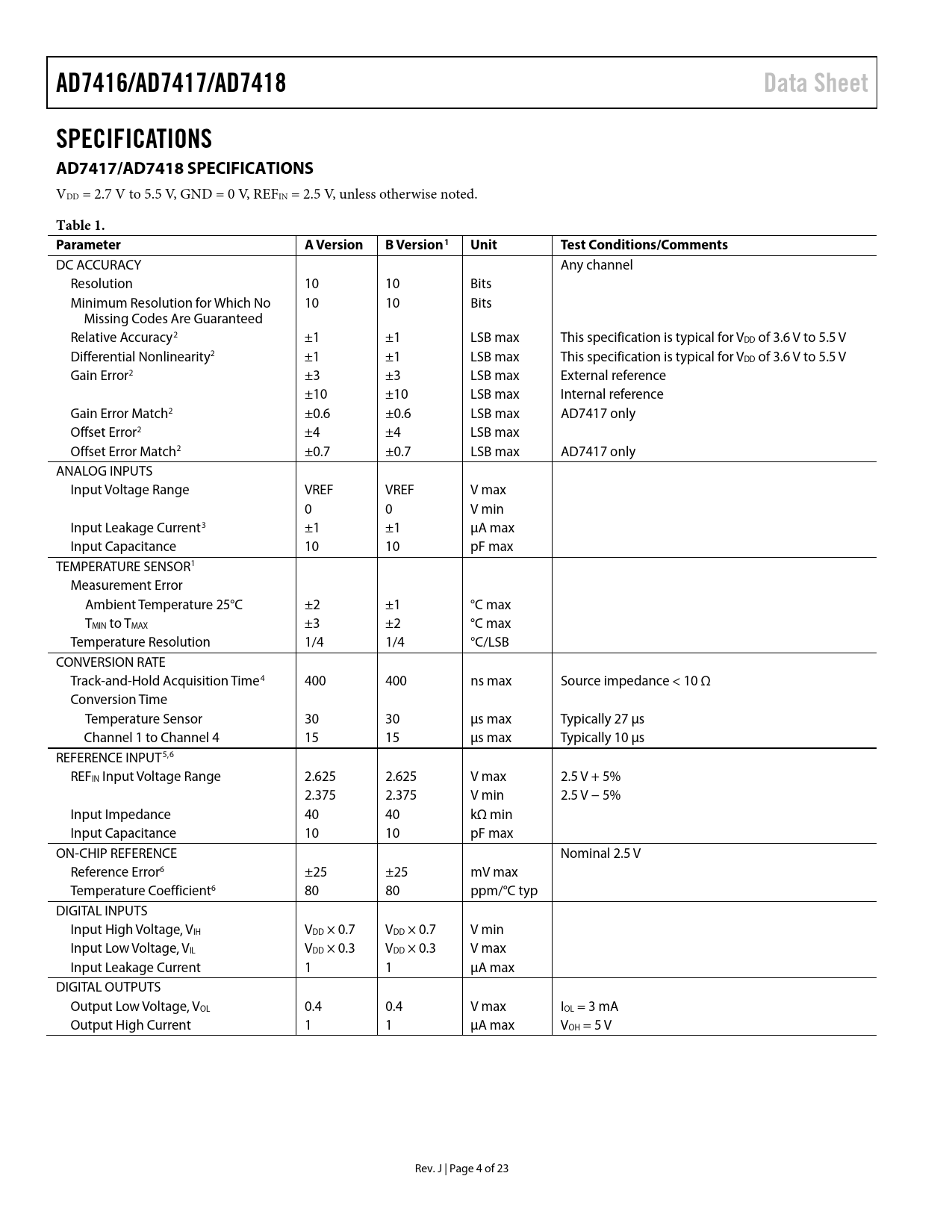 AD7416/AD7417/AD7418 Data Sheet SPECIFICATIONS AD7417/AD7418 SPECIFICATIONS Table 1 Parameter A Version B Version1 Unit