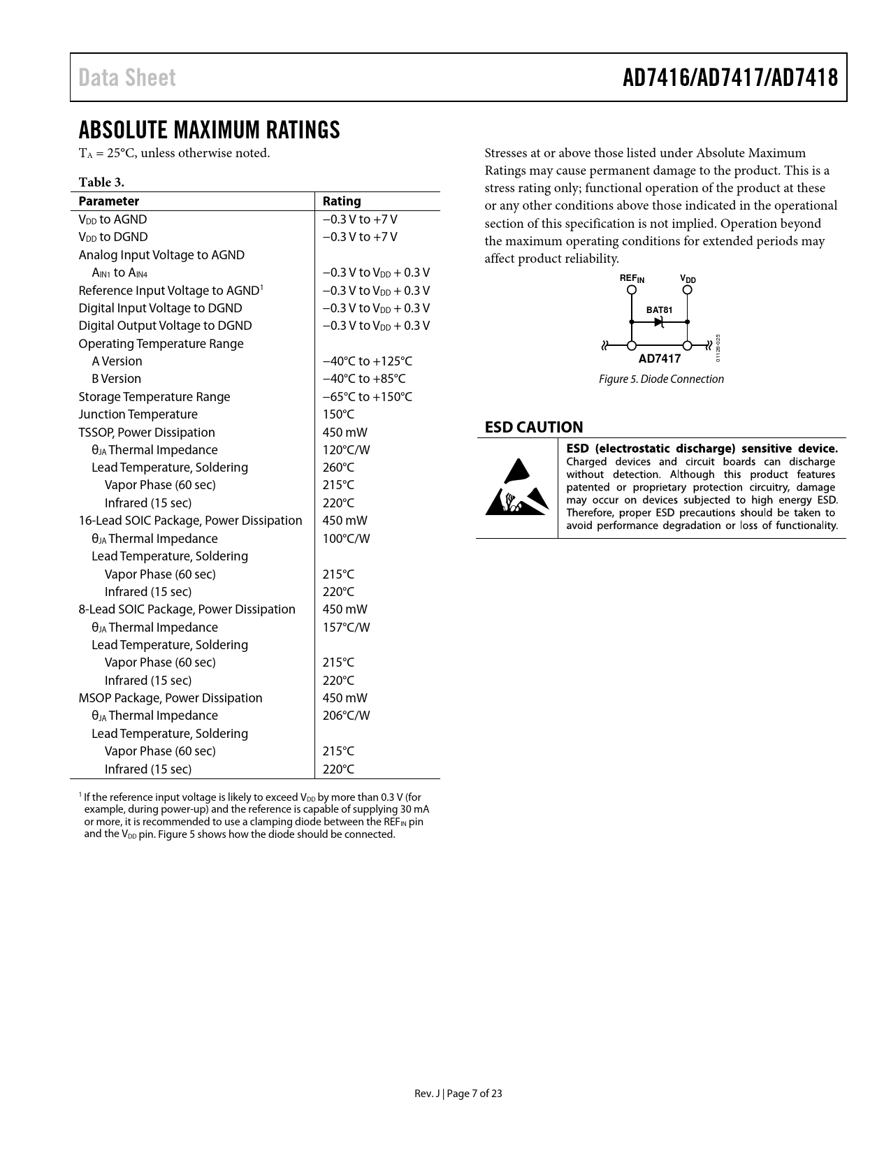 link to page 7 Data SheetAD7416/AD7417/AD7418ABSOLUTE MAXIMUM RATINGS TA = 25°C, unless otherwise noted. Stresses at or above those listed under Absolute Maximum Ratings may cause permanent damage to the product. This is a Table 3. stress rating only; functional operation of the product at these ParameterRating or any other conditions above those indicated in the operational VDD to AGND −0.3 V to +7 V section of this specification is not implied. Operation beyond VDD to DGND −0.3 V to +7 V the maximum operating conditions for extended periods may Analog Input Voltage to AGND affect product reliability. AIN1 to AIN4 −0.3 V to VDD + 0.3 V REFINVDD Reference Input Voltage to AGND1 −0.3 V to VDD + 0.3 V Digital Input Voltage to DGND −0.3 V to VDD + 0.3 V BAT81 Digital Output Voltage to DGND −0.3 V to VDD + 0.3 V Operating Temperature Range 025 A Version −40°C to +125°C 126- AD7417 1 0 B Version −40°C to +85°C Figure 5. Diode Connection Storage Temperature Range −65°C to +150°C Junction Temperature 150°C TSSOP, Power Dissipation 450 mW ESD CAUTION θJA Thermal Impedance 120°C/W Lead Temperature, Soldering 260°C Vapor Phase (60 sec) 215°C Infrared (15 sec) 220°C 16-Lead SOIC Package, Power Dissipation 450 mW θJA Thermal Impedance 100°C/W Lead Temperature, Soldering Vapor Phase (60 sec) 215°C Infrared (15 sec) 220°C 8-Lead SOIC Package, Power Dissipation 450 mW θJA Thermal Impedance 157°C/W Lead Temperature, Soldering Vapor Phase (60 sec) 215°C Infrared (15 sec) 220°C MSOP Package, Power Dissipation 450 mW θJA Thermal Impedance 206°C/W Lead Temperature, Soldering Vapor Phase (60 sec) 215°C Infrared (15 sec) 220°C 1 If the reference input voltage is likely to exceed VDD by more than 0.3 V (for example, during power-up) and the reference is capable of supplying 30 mA or more, it is recommended to use a clamping diode between the REFIN pin and the VDD pin. Figure 5 shows how the diode should be connected. Rev. J | Page 7 of 23 Document Outline FEATURES APPLICATIONS GENERAL DESCRIPTION FUNCTIONAL BLOCK DIAGRAMS TABLE OF CONTENTS REVISION HISTORY PRODUCT HIGHLIGHTS SPECIFICATIONS AD7417/AD7418 SPECIFICATIONS AD7416 SPECIFICATIONS ABSOLUTE MAXIMUM RATINGS ESD CAUTION PIN CONFIGURATIONS AND FUNCTION DESCRIPTIONS TERMINOLOGY THEORY OF OPERATION CIRCUIT INFORMATION CONVERTER DETAILS TYPICAL CONNECTION DIAGRAM ANALOG INPUTS ON-CHIP REFERENCE TEMPERATURE MEASUREMENT INTERNAL REGISTER STRUCTURE Address Pointer Register Temperature Value Register (Address 0x00) Configuration Register (Address 0x01) THYST Setpoint Register (Address 0x02) TOTI Setpoint Register (Address 0x03) ADC Value Register (Address 0x04) ADC Transfer Function Config2 Register (Address 0x05) SERIAL BUS INTERFACE Serial Bus Address Writing to the AD7416/AD7417/AD7418 Reading Data From the AD7416/AD7417/AD7418 OTI OUTPUT FAULT QUEUE POWER-ON DEFAULTS OPERATING MODES Mode 1 Mode 2 CONVSTB START MODE CONVSTB Pin Mode APPLICATIONS INFORMATION SUPPLY DECOUPLING POWER-ON RESET MOUNTING THE AD7416/AD7417/AD7418 FAN CONTROLLER THERMOSTAT SYSTEM WITH MULTIPLE AD7416 DEVICES OUTLINE DIMENSIONS ORDERING GUIDE