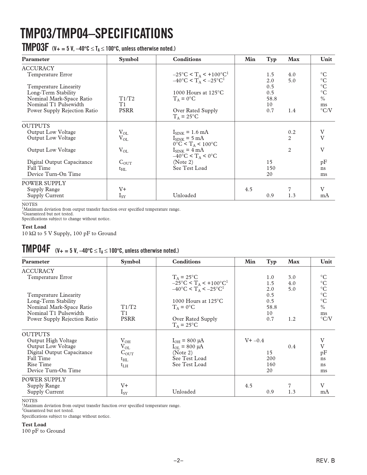 TMP03/TMP04–SPECIFICATIONS TMP03F (V+ = 5 V, –40 100 C, unless otherwise noted.) Parameter Symbol Conditions Min Typ Max Unit