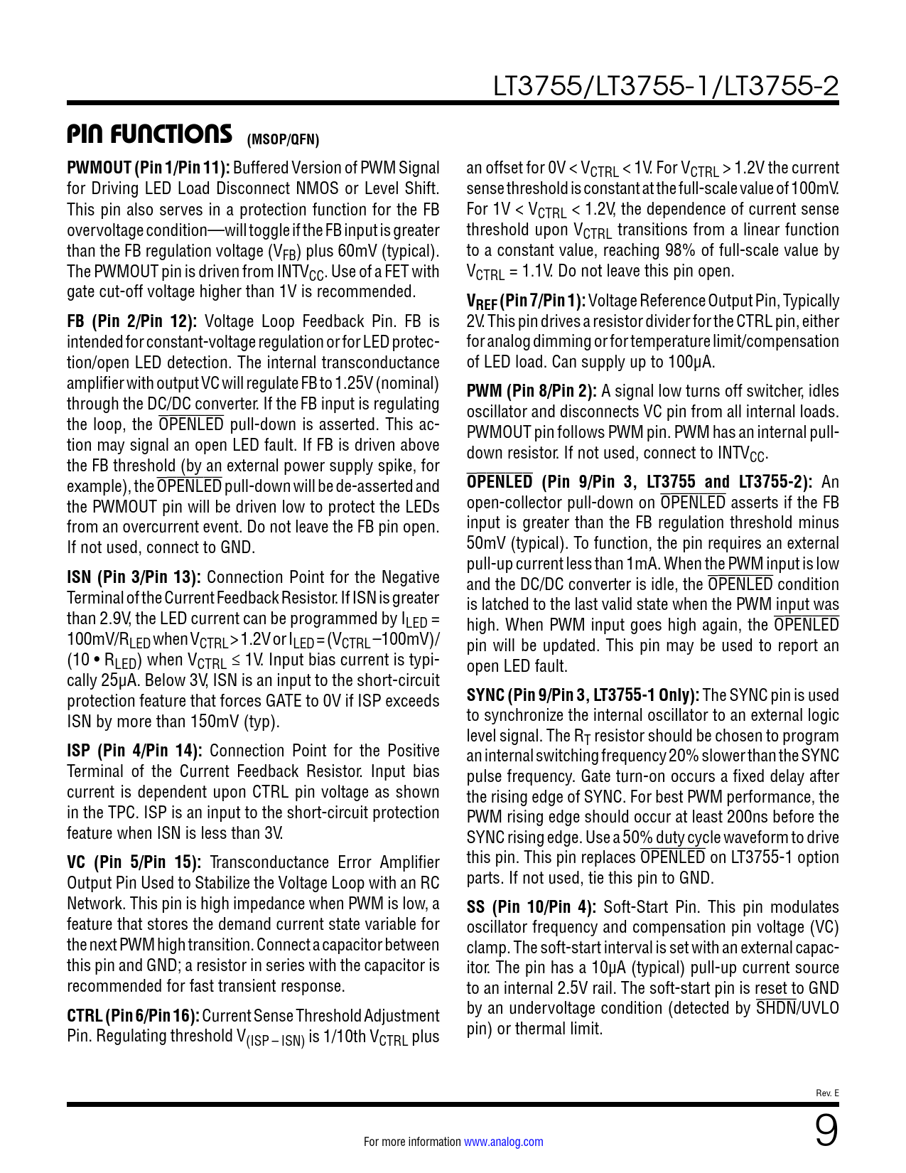 Transconductance Error Amplifier this pin. This pin replaces OPENLED on LT3755-1 option Output Pin Used to Stabilize the Voltage Loop with an RC parts. If not used, tie this pin to GND. Network. This pin is high impedance when PWM is low, a