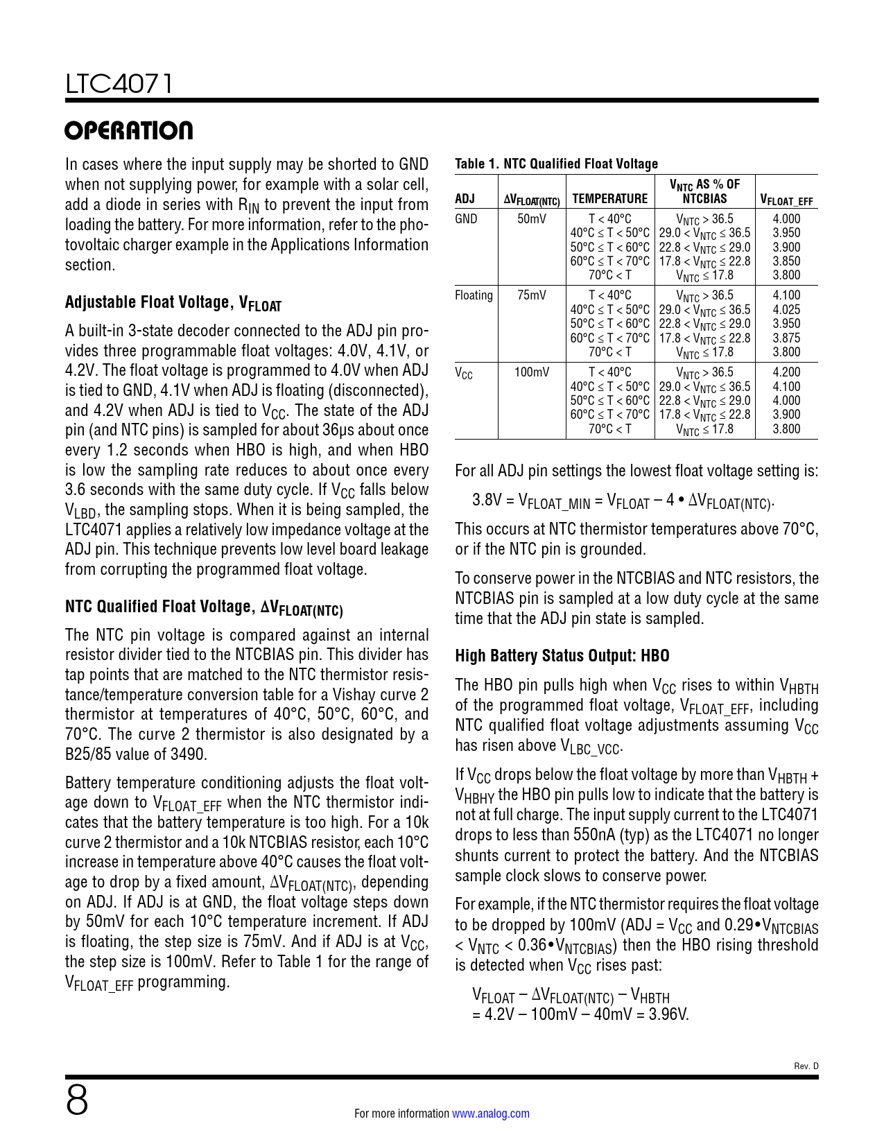 OPERATION. Table 1. NTC Qualified Float Voltage. VNTC AS % OF. ADJ. NTCBIAS. FLOAT(NTC) TEMPERATURE. FLOAT_EFF