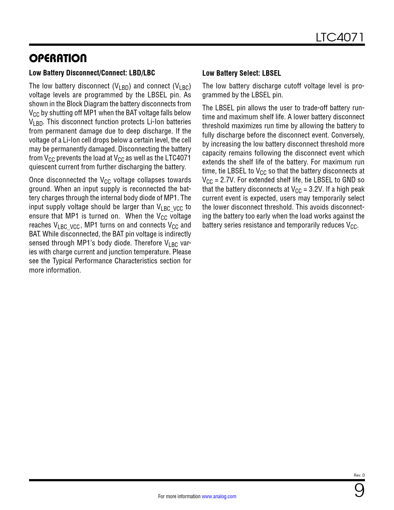 OPERATION Low Battery Disconnect/Connect: LBD/LBC Low Battery Select: LBSEL