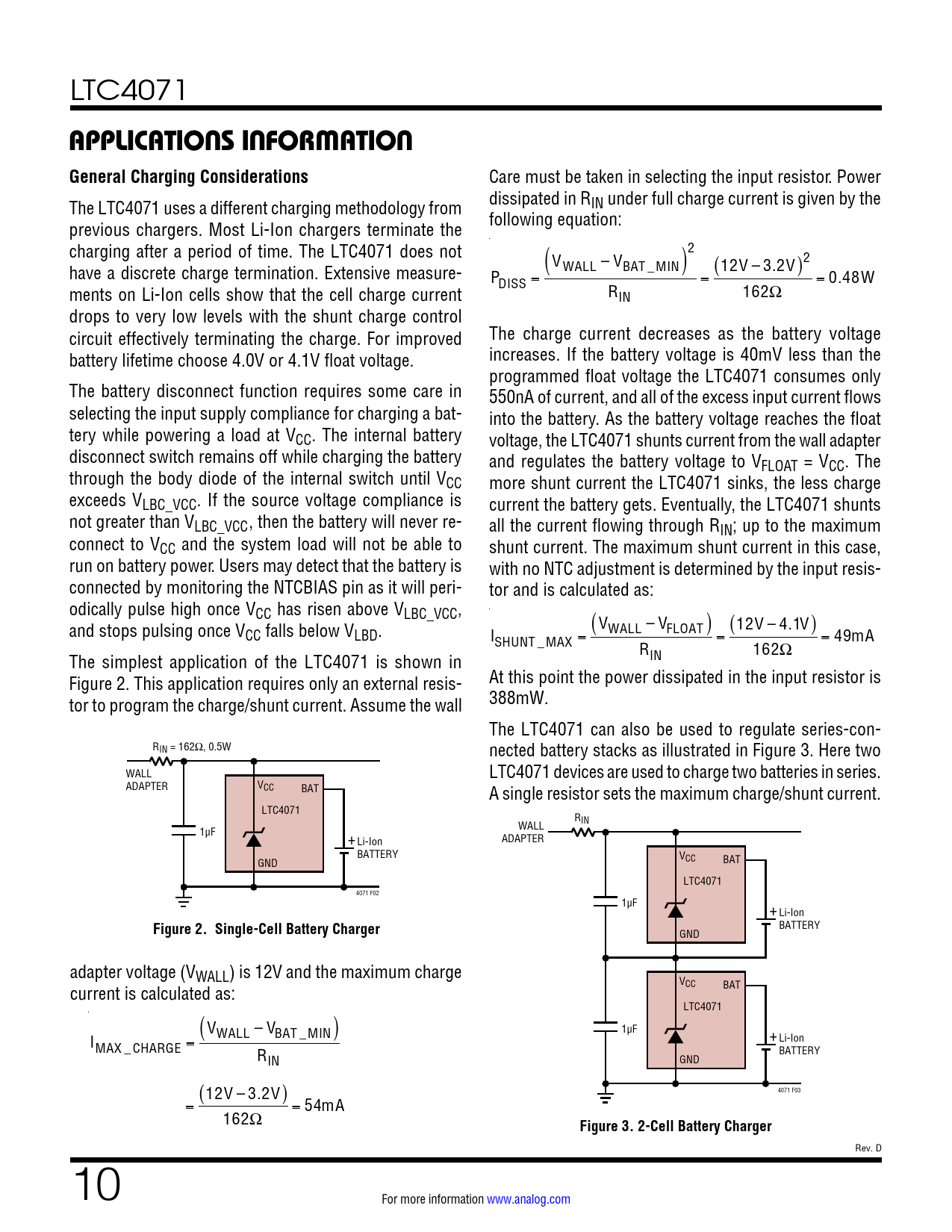 link to page 10 link to page 10 LTC4071 APPLICATIONS INFORMATIONGeneral Charging Considerations Care must be taken in selecting the input resistor. Power dissipated in RIN under full charge current is given by the The LTC4071 uses a different charging methodology from following equation: previous chargers. Most Li-Ion chargers terminate the charging after a period of time. The LTC4071 does not V ( WALL – VBAT_MIN)2 (12V –3.2V)2 have a discrete charge termination. Extensive measure- PDISS = = = 0.48W ments on Li-Ion cells show that the cell charge current RIN 162Ω drops to very low levels with the shunt charge control The charge current decreases as the battery voltage circuit effectively terminating the charge. For improved increases. If the battery voltage is 40mV less than the battery lifetime choose 4.0V or 4.1V float voltage. programmed float voltage the LTC4071 consumes only The battery disconnect function requires some care in 550nA of current, and all of the excess input current flows selecting the input supply compliance for charging a bat- into the battery. As the battery voltage reaches the float tery while powering a load at VCC. The internal battery voltage, the LTC4071 shunts current from the wall adapter disconnect switch remains off while charging the battery and regulates the battery voltage to VFLOAT = VCC. The through the body diode of the internal switch until VCC more shunt current the LTC4071 sinks, the less charge exceeds VLBC_VCC. If the source voltage compliance is current the battery gets. Eventually, the LTC4071 shunts not greater than VLBC_VCC, then the battery will never re- all the current flowing through RIN; up to the maximum connect to VCC and the system load will not be able to shunt current. The maximum shunt current in this case, run on battery power. Users may detect that the battery is with no NTC adjustment is determined by the input resis- connected by monitoring the NTCBIAS pin as it will peri- tor and is calculated as: odically pulse high once VCC has risen above VLBC_VCC, and stops pulsing once V (V ) (12V – 4.1V) CC falls below VLBD. I WALL – VFLOAT SHUNT _MAX = = = 49mA RIN 162Ω The simplest application of the LTC4071 is shown in At this point the power dissipated in the input resistor is Figure 2. This application requires only an external resis- 388mW. tor to program the charge/shunt current. Assume the wall The LTC4071 can also be used to regulate series-con- RIN = 162Ω, 0.5W nected battery stacks as illustrated in Figure 3. Here two WALL LTC4071 devices are used to charge two batteries in series. ADAPTER VCC BAT A single resistor sets the maximum charge/shunt current. LTC4071 RIN WALL 1µF + ADAPTER Li-Ion BATTERY VCC BAT GND LTC4071 4071 F02 1µF +Li-Ion BATTERY Figure 2. Single-Cell Battery Charger GND adapter voltage (VWALL) is 12V and the maximum charge V current is calculated as: CC BAT LTC4071 V ( ) 1µF I WALL – VBAT _MIN +Li-Ion MAX _ CHARGE = R BATTERY IN GND (12V – 3.2V) 4071 F03 = = 54mA 162Ω Figure 3. 2-Cell Battery Charger Rev. D 10 For more information www.analog.com Document Outline Features Applications Typical Application Description Absolute Maximum Ratings Pin Configuration Order Information Electrical Characteristics Typical Performance Characteristics Pin Functions Block Diagram Operation Applications Information Package Description Revision History Typical Application Related Parts