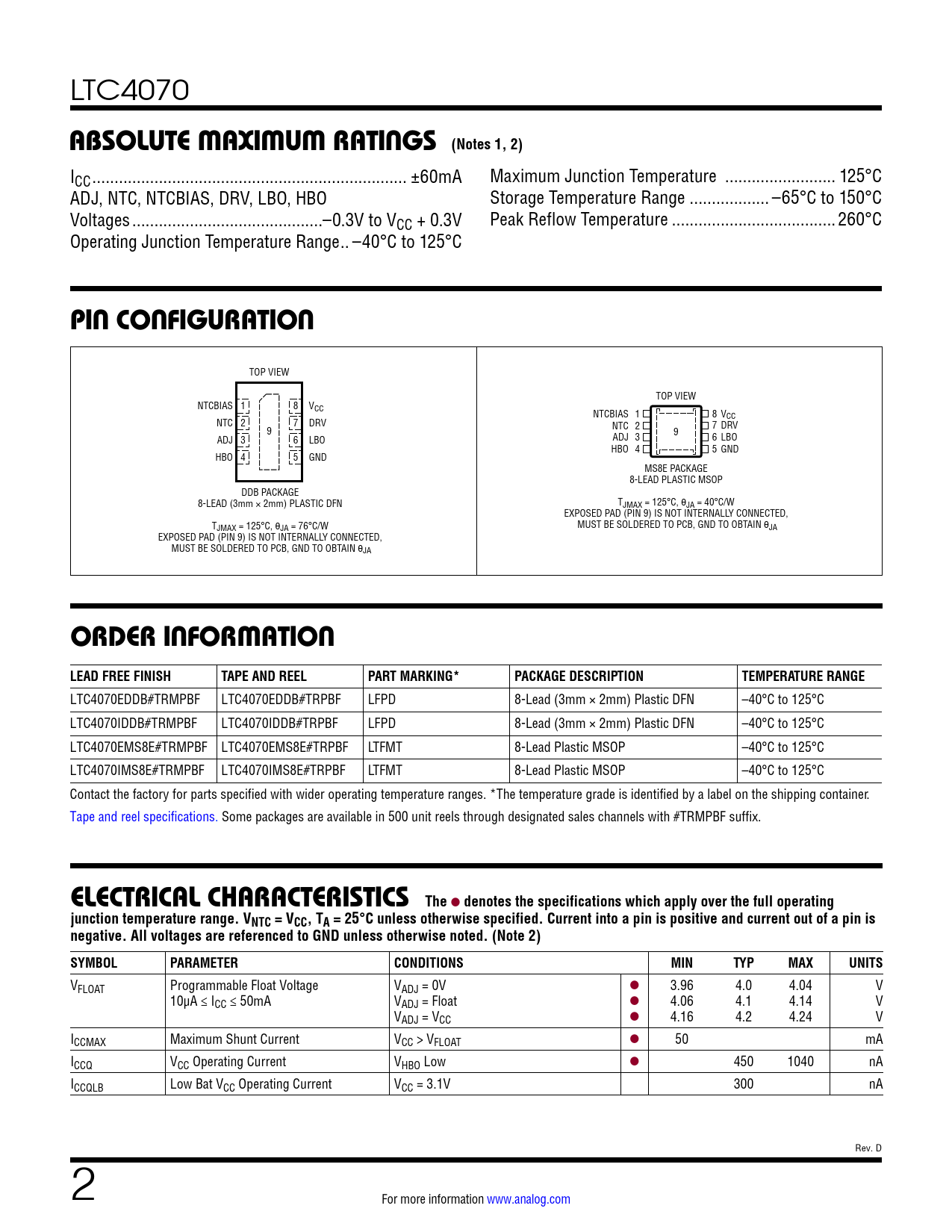 LTC4070 ABSOLUTE MAXIMUM RATINGS (Notes 1, 2) ICC ... ±60mA Maximum Junction Temperature ... 125°C ADJ, NTC, NTCBIAS, DRV, LBO, HBO Storage Temperature Range .. –65°C to 150°C Voltages ...–0.3V to VCC + 0.3V Peak Reflow Temperature ...260°C Operating Junction Temperature Range .. –40°C to 125°C PIN CONFIGURATION TOP VIEW TOP VIEW NTCBIAS 1 8 VCC NTCBIAS 1 8 VCC NTC 2 7 DRV 9 NTC 2 7 DRV 9 ADJ 3 6 LBO ADJ 3 6 LBO HBO 4 5 GND HBO 4 5 GND MS8E PACKAGE 8-LEAD PLASTIC MSOP DDB PACKAGE 8-LEAD (3mm × 2mm) PLASTIC DFN TJMAX = 125°C, θJA = 40°C/W EXPOSED PAD (PIN 9) IS NOT INTERNALLY CONNECTED, TJMAX = 125°C, θJA = 76°C/W MUST BE SOLDERED TO PCB, GND TO OBTAIN θJA EXPOSED PAD (PIN 9) IS NOT INTERNALLY CONNECTED, MUST BE SOLDERED TO PCB, GND TO OBTAIN θJA ORDER INFORMATION LEAD FREE FINISHTAPE AND REELPART MARKING*PACKAGE DESCRIPTIONTEMPERATURE RANGE LTC4070EDDB#TRMPBF LTC4070EDDB#TRPBF LFPD 8-Lead (3mm × 2mm) Plastic DFN –40°C to 125°C LTC4070IDDB#TRMPBF LTC4070IDDB#TRPBF LFPD 8-Lead (3mm × 2mm) Plastic DFN –40°C to 125°C LTC4070EMS8E#TRMPBF LTC4070EMS8E#TRPBF LTFMT 8-Lead Plastic MSOP –40°C to 125°C LTC4070IMS8E#TRMPBF LTC4070IMS8E#TRPBF LTFMT 8-Lead Plastic MSOP –40°C to 125°C Contact the factory for parts specified with wider operating temperature ranges. *The temperature grade is identified by a label on the shipping container. Tape and reel specifications. Some packages are available in 500 unit reels through designated sales channels with #TRMPBF suffix. ELECTRICAL CHARACTERISTICSThe l denotes the specifications which apply over the full operatingjunction temperature range. VNTC = VCC, TA = 25°C unless otherwise specified. Current into a pin is positive and current out of a pin isnegative. All voltages are referenced to GND unless otherwise noted. (Note 2) SYMBOLPARAMETERCONDITIONSMINTYPMAXUNITS VFLOAT Programmable Float Voltage VADJ = 0V l 3.96 4.0 4.04 V 10µA ≤ ICC ≤ 50mA VADJ = Float l 4.06 4.1 4.14 V VADJ = VCC l 4.16 4.2 4.24 V ICCMAX Maximum Shunt Current VCC > VFLOAT l 50 mA ICCQ VCC Operating Current VHBO Low l 450 1040 nA ICCQLB Low Bat VCC Operating Current VCC = 3.1V 300 nA Rev. D 2 For more information www.analog.com Document Outline Features Applications Typical Application Description Absolute Maximum Ratings Pin Configuration Order Information Electrical Characteristics Typical Performance Characteristics Pin Functions Block Diagram Operation Applications Information Typical Applications Package Description Revision History Typical Application Related Parts