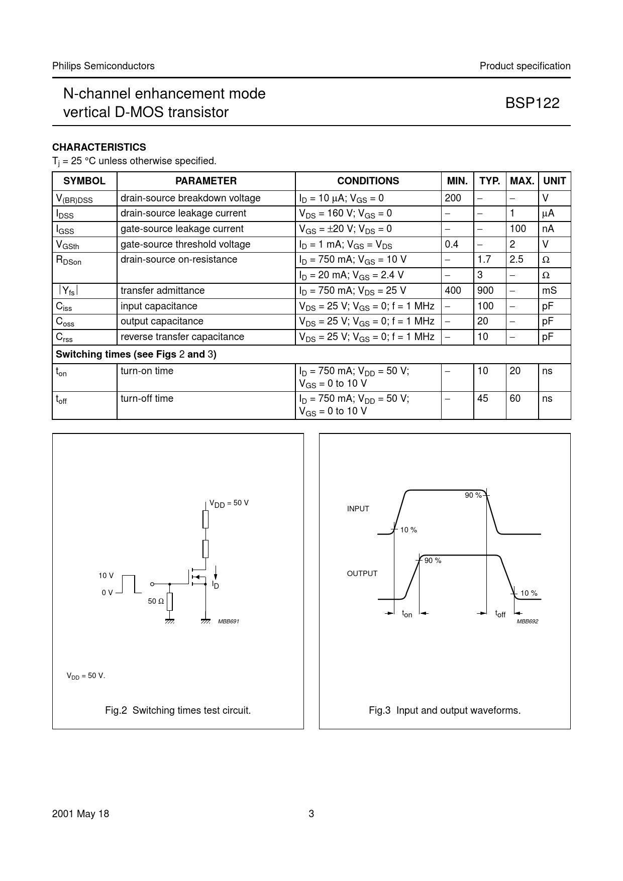 ton turn-on time ID = 750 mA; VDD = 50 V; − 10 20 ns VGS = 0 to 10 V toff turn-off time ID = 750 mA; VDD = 50 V; − 45 60 ns VGS = 0 to 10 V handbook, halfpage 90 % handbook, halfpage VDD = 50 V INPUT 10 % 90 % 10 V OUTPUT ID 0 V 10 % 50 Ω ton toff MBB691 MBB692 VDD = 50 V. Fig.2 Switching times test circuit. Fig.3 Input and output waveforms. 2001 May 18 3 Document Outline FEATURES QUICK REFERENCE DATA DESCRIPTION PINNING - SOT223 LIMITING VALUES THERMAL CHARACTERISTICS CHARACTERISTICS PACKAGE OUTLINE SOT223 DATA SHEET STATUS DEFINITIONS DISCLAIMERS NOTES
