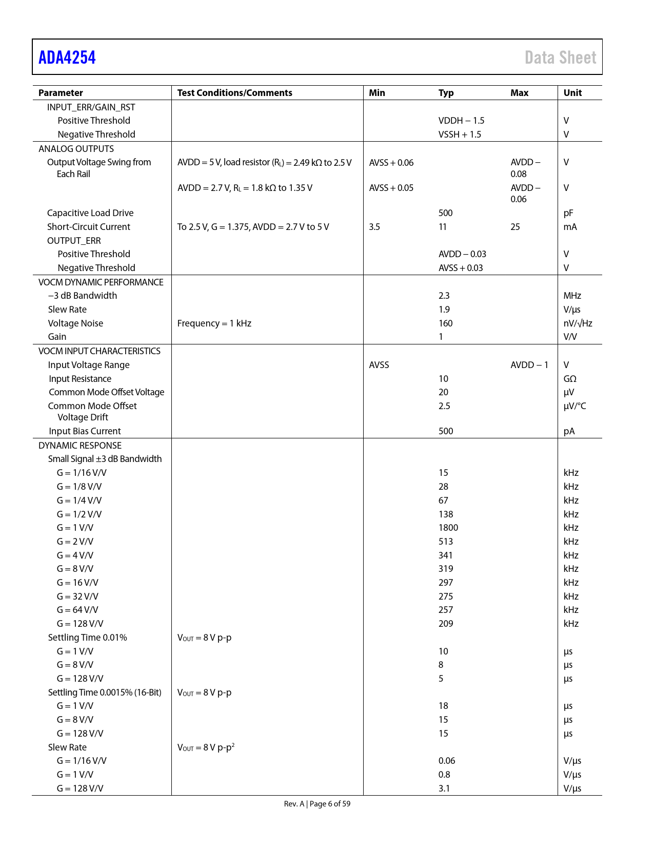Páginas / Página59 / 6 — ADA4254. Data Sheet. Parameter. Test Conditions/Comments. Min. Typ. Max. …