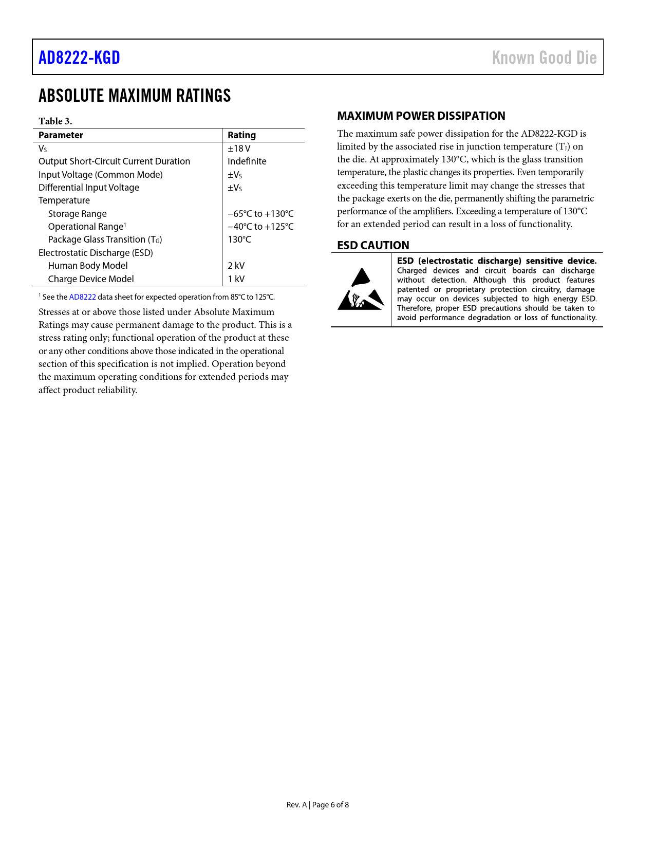 AD8222-KGD Known Good Die ABSOLUTE MAXIMUM RATINGS Table 3 MAXIMUM POWER DISSIPATION Parameter Rating ESD CAUTION