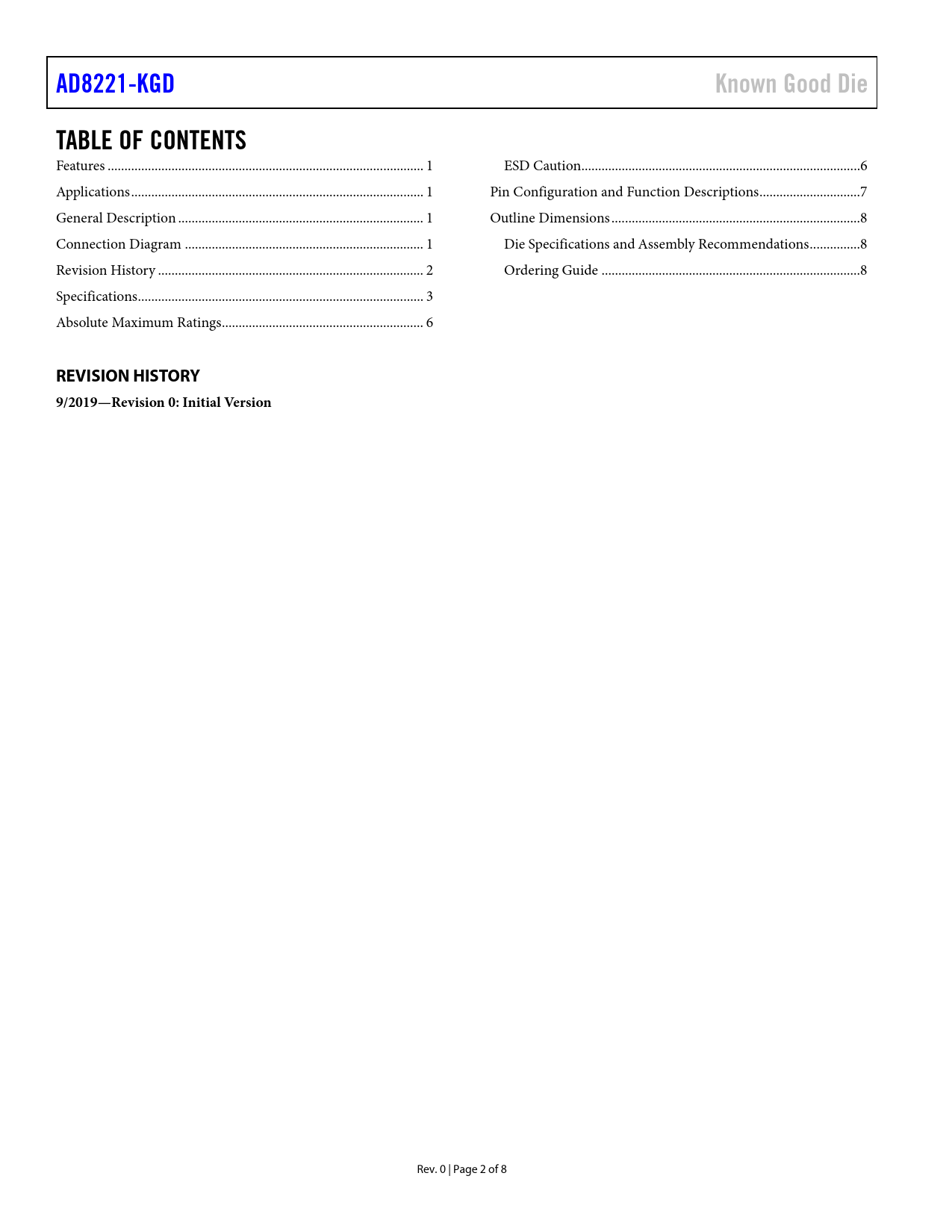 link to page 1 link to page 1 link to page 1 link to page 1 link to page 2 link to page 3 link to page 6 link to page 6 link to page 7 link to page 8 link to page 8 link to page 8 AD8221-KGDKnown Good DieTABLE OF CONTENTS Features .. 1 ESD Caution...6 Applications ... 1 Pin Configuration and Function Descriptions ..7 General Description ... 1 Outline Dimensions ..8 Connection Diagram ... 1 Die Specifications and Assembly Recommendations ...8 Revision History ... 2 Ordering Guide ...8 Specifications ... 3 Absolute Maximum Ratings .. 6 REVISION HISTORY 9/2019—Revision 0: Initial Version Rev. 0 | Page 2 of 8 Document Outline FEATURES APPLICATIONS GENERAL DESCRIPTION CONNECTION DIAGRAM TABLE OF CONTENTS REVISION HISTORY SPECIFICATIONS ABSOLUTE MAXIMUM RATINGS ESD CAUTION PIN CONFIGURATION AND FUNCTION DESCRIPTIONS OUTLINE DIMENSIONS DIE SPECIFICATIONS AND ASSEMBLY RECOMMENDATIONS ORDERING GUIDE