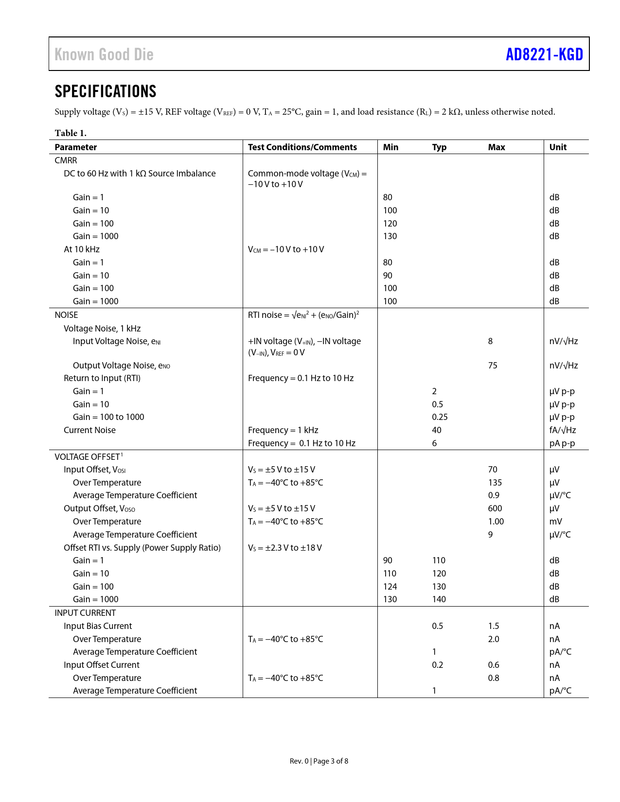 Known Good Die AD8221-KGD SPECIFICATIONS Table 1 Parameter Test Conditions/Comments Min Typ Max Unit