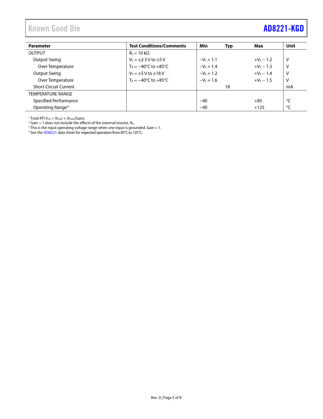 Páginas / Página8 / 5 — Known Good Die. AD8221-KGD. Parameter. Test Conditions/Comments. Min. …