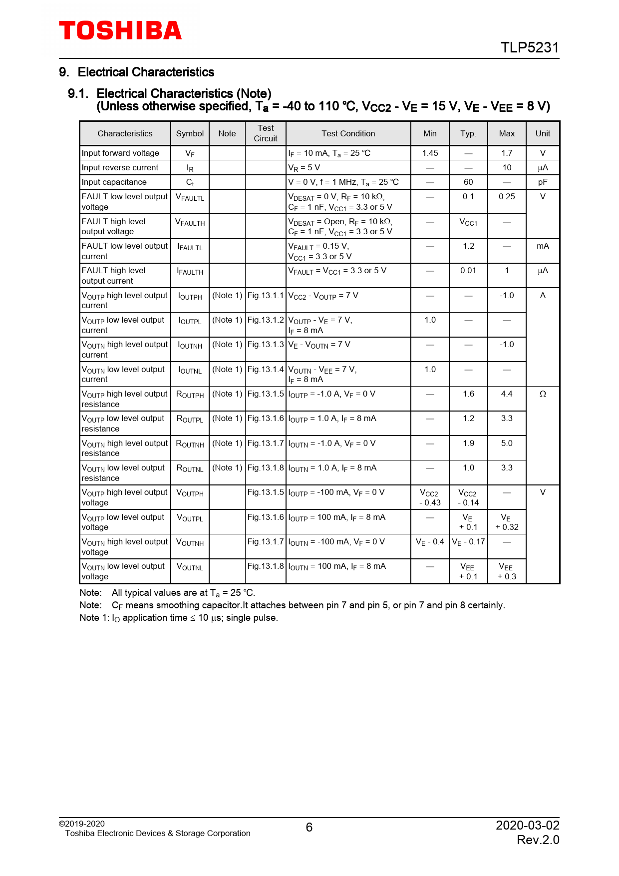 TLP5231. 9. Electrical. Characteristics. 9.1. Electrical. Characteristics. (Note). (Unless. otherwise. specified,. Ta. =. -40. to. 110. ,. VCC2. -. VE. =. 15. V,. VE