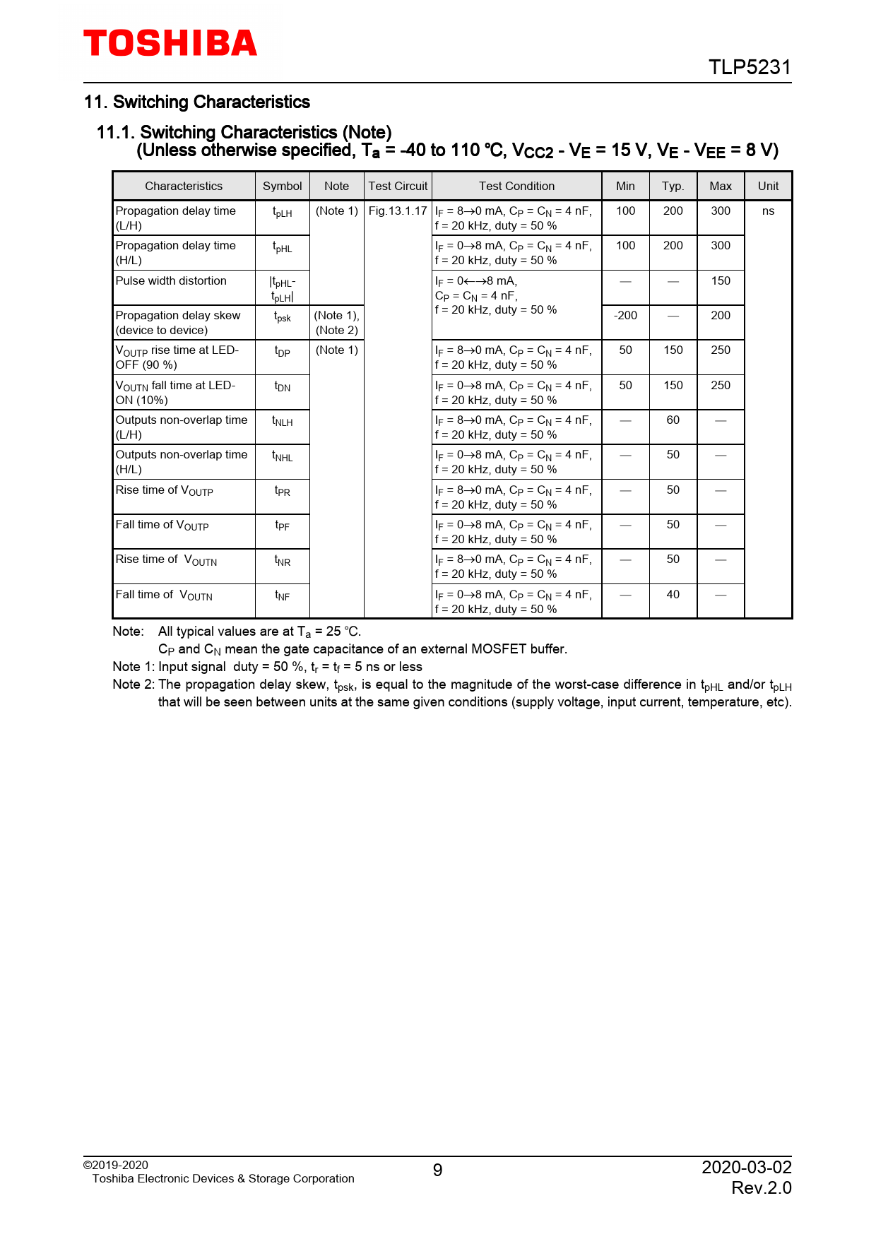 TLP5231 11. Switching Characteristics 11.1. Switching Characteristics (Note) (Unless otherwise specified, Ta = -40 to 110 , VCC2 - VE = 15 V, VE - VEE = 8 V) Characteristics Symbol Note Test Circuit Test Condition Min Typ. Max Unit Propagation delay time tpLH (Note 1) Fig.13.1.17 IF = 8→0 mA, CP = CN = 4 nF, 100 200 300 ns (L/H) f = 20 kHz, duty = 50 % Propagation delay time tpHL IF = 0→8 mA, CP = CN = 4 nF, 100 200 300 (H/L) f = 20 kHz, duty = 50 % Pulse width distortion |tpHL- IF = 0←→8 mA, 150 tpLH| CP = CN = 4 nF, Propagation delay skew t f = 20 kHz, duty = 50 % psk (Note 1), -200 200 (device to device) (Note 2) VOUTP rise time at LED- tDP (Note 1) IF = 8→0 mA, CP = CN = 4 nF, 50 150 250 OFF (90 %) f = 20 kHz, duty = 50 % VOUTN fall time at LED- tDN IF = 0→8 mA, CP = CN = 4 nF, 50 150 250 ON (10%) f = 20 kHz, duty = 50 % Outputs non-overlap time tNLH IF = 8→0 mA, CP = CN = 4 nF, 60 (L/H) f = 20 kHz, duty = 50 % Outputs non-overlap time tNHL IF = 0→8 mA, CP = CN = 4 nF, 50 (H/L) f = 20 kHz, duty = 50 % Rise time of VOUTP tPR IF = 8→0 mA, CP = CN = 4 nF, 50 f = 20 kHz, duty = 50 % Fall time of VOUTP tPF IF = 0→8 mA, CP = CN = 4 nF, 50 f = 20 kHz, duty = 50 % Rise time of VOUTN tNR IF = 8→0 mA, CP = CN = 4 nF, 50 f = 20 kHz, duty = 50 % Fall time of VOUTN tNF IF = 0→8 mA, CP = CN = 4 nF, 40 f = 20 kHz, duty = 50 % Note: All typical values are at Ta = 25 . CP and CN mean the gate capacitance of an external MOSFET buffer. Note 1: Input signal duty = 50 %, tr = tf = 5 ns or less Note 2: The propagation delay skew, tpsk, is equal to the magnitude of the worst-case difference in tpHL and/or tpLH that will be seen between units at the same given conditions (supply voltage, input current, temperature, etc). ©2019-2020 9 2020-03-02 Toshiba Electronic Devices & Storage Corporation Rev.2.0