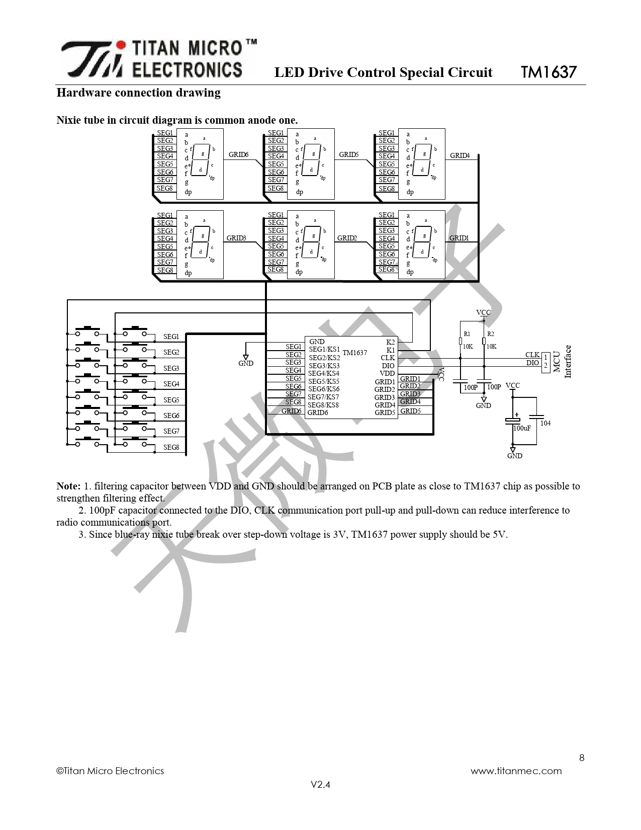 1. filtering capacitor between VDD and GND should be arranged on PCB plate as close to TM1637 chip as possible to strengthen filtering effect. 2. 100pF capacitor connected to the DIO, CLK communication port pull-up and pull-down can reduce interference to radio communications port. 3. Since blue-ray nixie tube break over step-down voltage is 3V, TM1637 power supply should be 5V. 8 ©Titan Micro Electronics www.titanmec.com V2.4