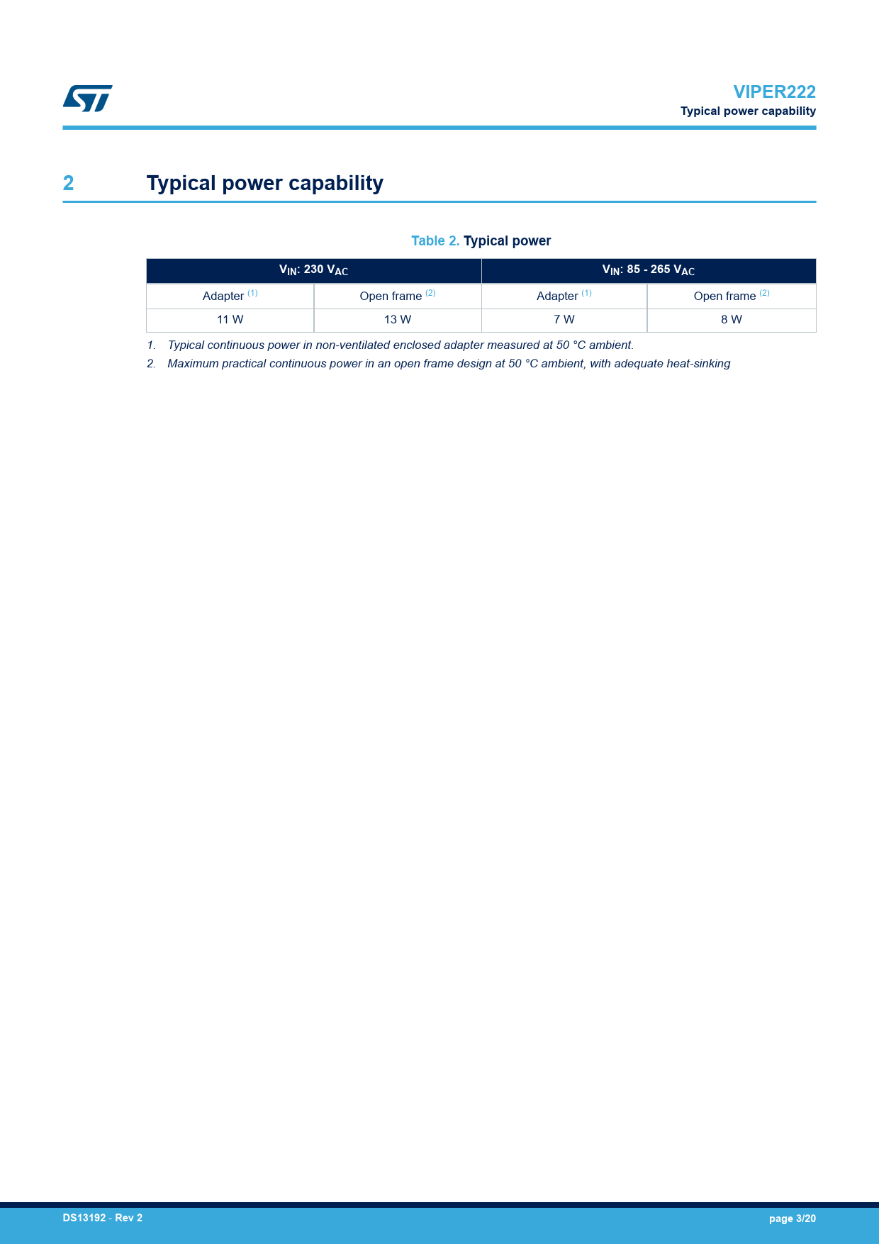 VIPER222. Typical power capability. Table 2. Typical power. VIN: 230 VAC. VIN: 85 - 265 VAC. DS13192. Rev 2. page 3/20