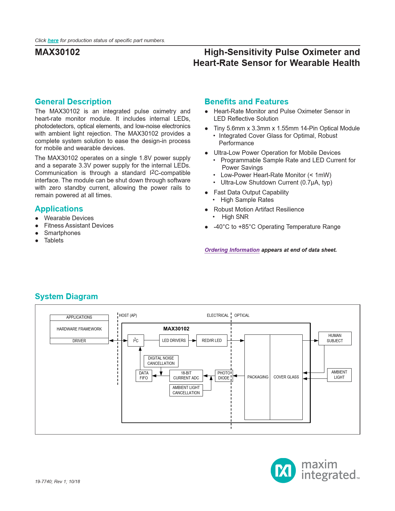 link to page 31 Click here for production status of specific part numbers. MAX30102High-Sensitivity Pulse Oximeter andHeart-Rate Sensor for Wearable HealthGeneral DescriptionBenefits and Features The MAX30102 is an integrated pulse oximetry and ● Heart-Rate Monitor and Pulse Oximeter Sensor in heart-rate monitor module. It includes internal LEDs, LED Reflective Solution photodetectors, optical elements, and low-noise electronics ● Tiny 5.6mm x 3.3mm x 1.55mm 14-Pin Optical Module with ambient light rejection. The MAX30102 provides a • Integrated Cover Glass for Optimal, Robust complete system solution to ease the design-in process Performance for mobile and wearable devices. ● Ultra-Low Power Operation for Mobile Devices The MAX30102 operates on a single 1.8V power supply • Programmable Sample Rate and LED Current for and a separate 3.3V power supply for the internal LEDs. Power Savings Communication is through a standard I2C-compatible • Low-Power Heart-Rate Monitor (< 1mW) interface. The module can be shut down through software • Ultra-Low Shutdown Current (0.7µA, typ) with zero standby current, allowing the power rails to remain powered at all times. ● Fast Data Output Capability • High Sample Rates Applications ● Robust Motion Artifact Resilience ● Wearable Devices • High SNR ● Fitness Assistant Devices ● -40°C to +85°C Operating Temperature Range ● Smartphones ● Tablets Ordering Informationappears at end of data sheet.System Diagram HOST (AP) ELECTRICAL OPTICAL APPLICATIONS HARDWARE FRAMEWORK MAX30102 HUMAN DRIVER I2C LED DRIVERS RED/IR LED SUBJECT DIGITAL NOISE CANCELLATION DATA 18-BIT PHOTO AMBIENT FIFO CURRENT ADC DIODE PACKAGING COVER GLASS LIGHT AMBIENT LIGHT CANCELLATION 19-7740; Rev 1; 10/18