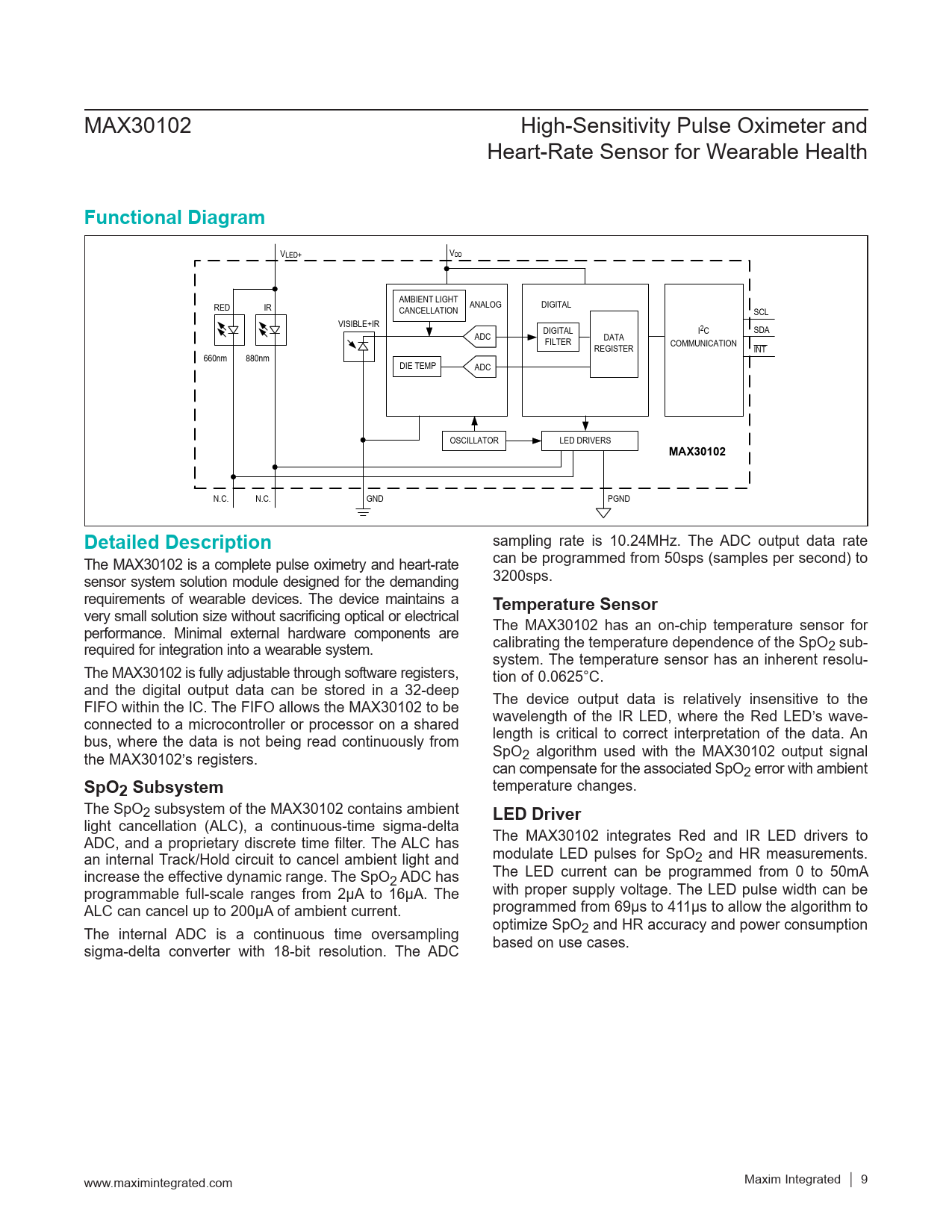 Functional Diagram MAX30102 Detailed Description Temperature Sensor SpO2 Subsystem LED Driver