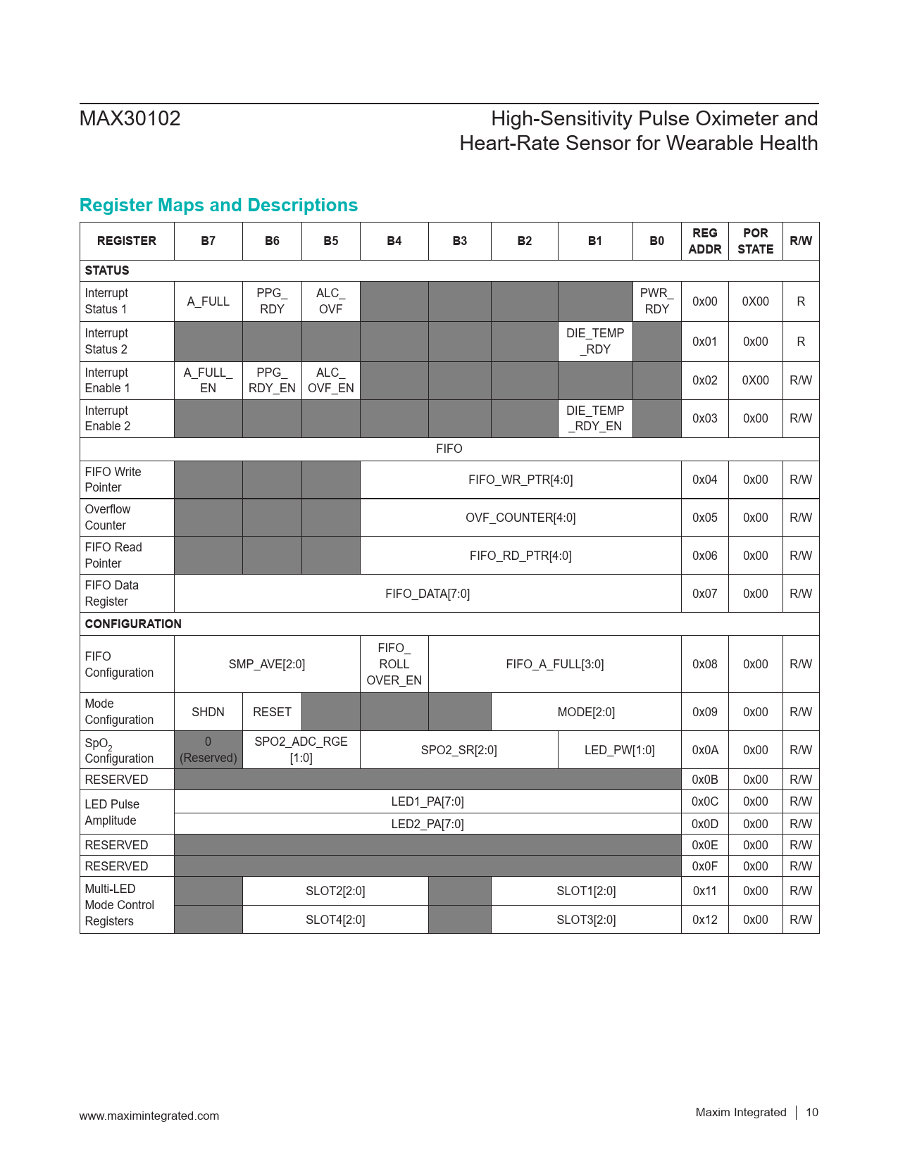 Interrupt ALC_ PWR_ Status 1 A_FULL PPG_ RDY OVF RDY 0x00 0X00 R Interrupt DIE_TEMP Status 2 _RDY 0x01 0x00 R Interrupt A_FULL_ PPG_ ALC_ Enable 1 EN RDY_EN OVF_EN 0x02 0X00 R/W Interrupt DIE_TEMP Enable 2 _RDY_EN 0x03 0x00 R/W FIFO FIFO Write Pointer FIFO_WR_PTR[4:0] 0x04 0x00 R/W Overflow Counter OVF_COUNTER[4:0] 0x05 0x00 R/W FIFO Read Pointer FIFO_RD_PTR[4:0] 0x06 0x00 R/W FIFO Data Register FIFO_DATA[7:0] 0x07 0x00 R/W