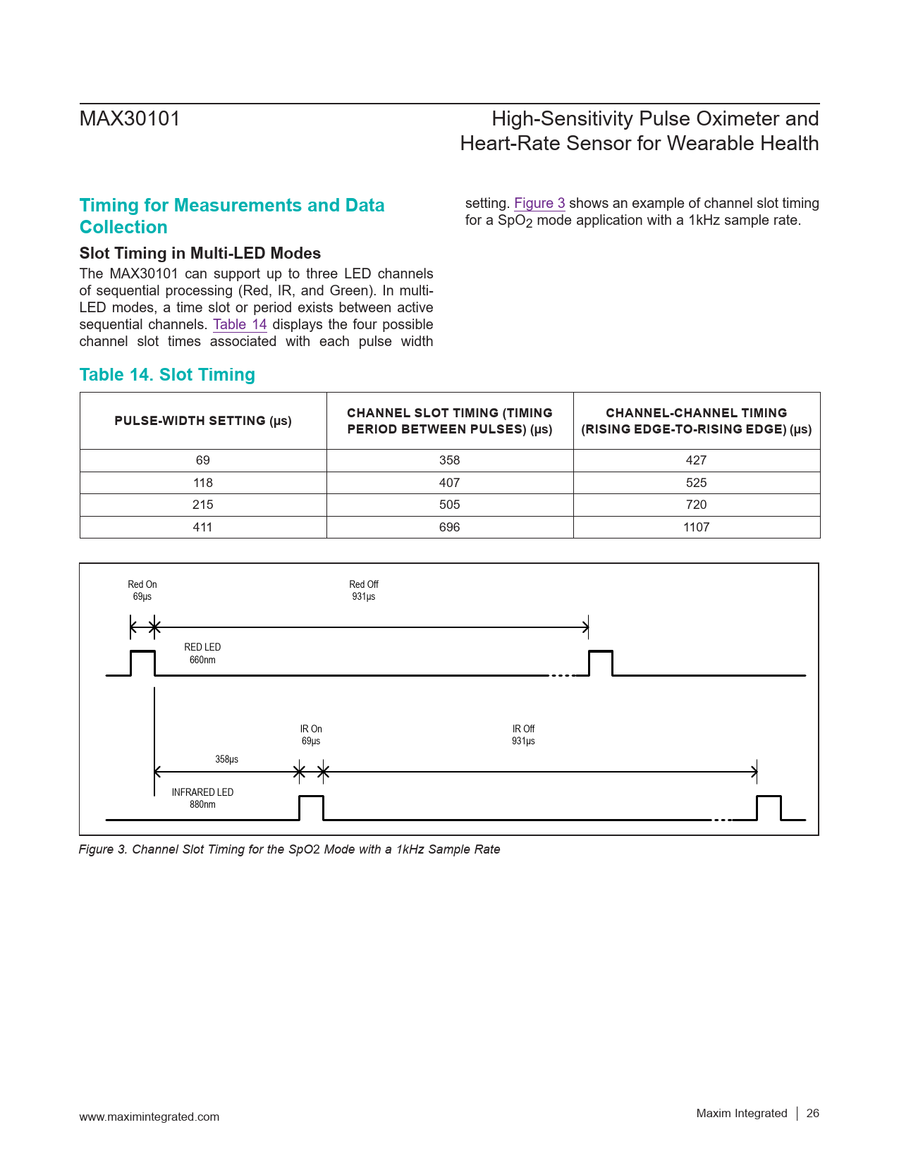 The MAX30101 can support up to three LED channels of sequential processing (Red, IR, and Green). In multi- LED modes, a time slot or period exists between active sequential channels. Table 14 displays the four possible channel slot times associated with each pulse width
