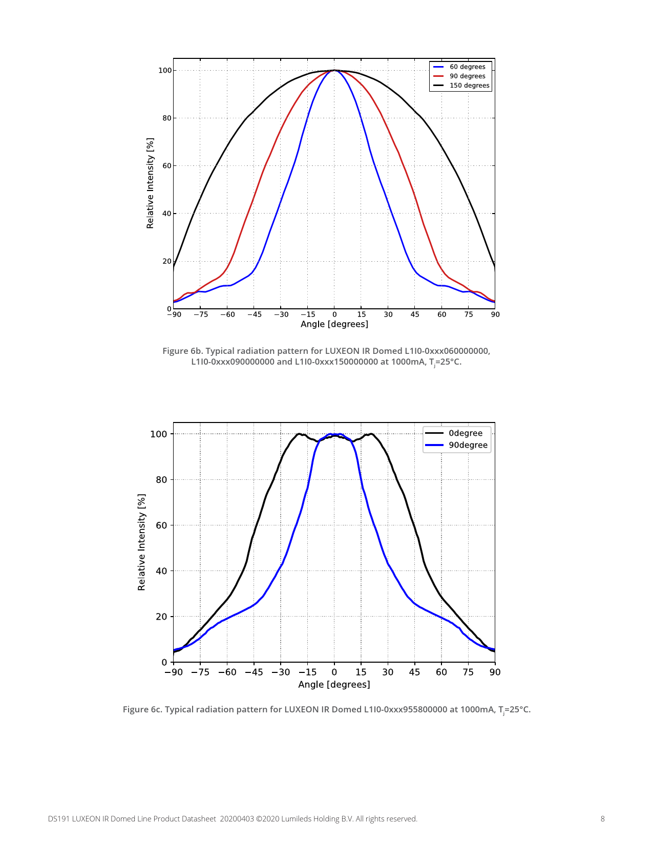 Figure 6b . Typical radiation pattern for LUXEON IR Domed L1I0-0xxx060000000, L1I0-0xxx090000000 and L1I0-0xxx150000000 at 1000mA, T =25°C . j Figure 6c . Typical radiation pattern for LUXEON IR Domed L1I0-0xxx955800000 at 1000mA, T =25°C . j