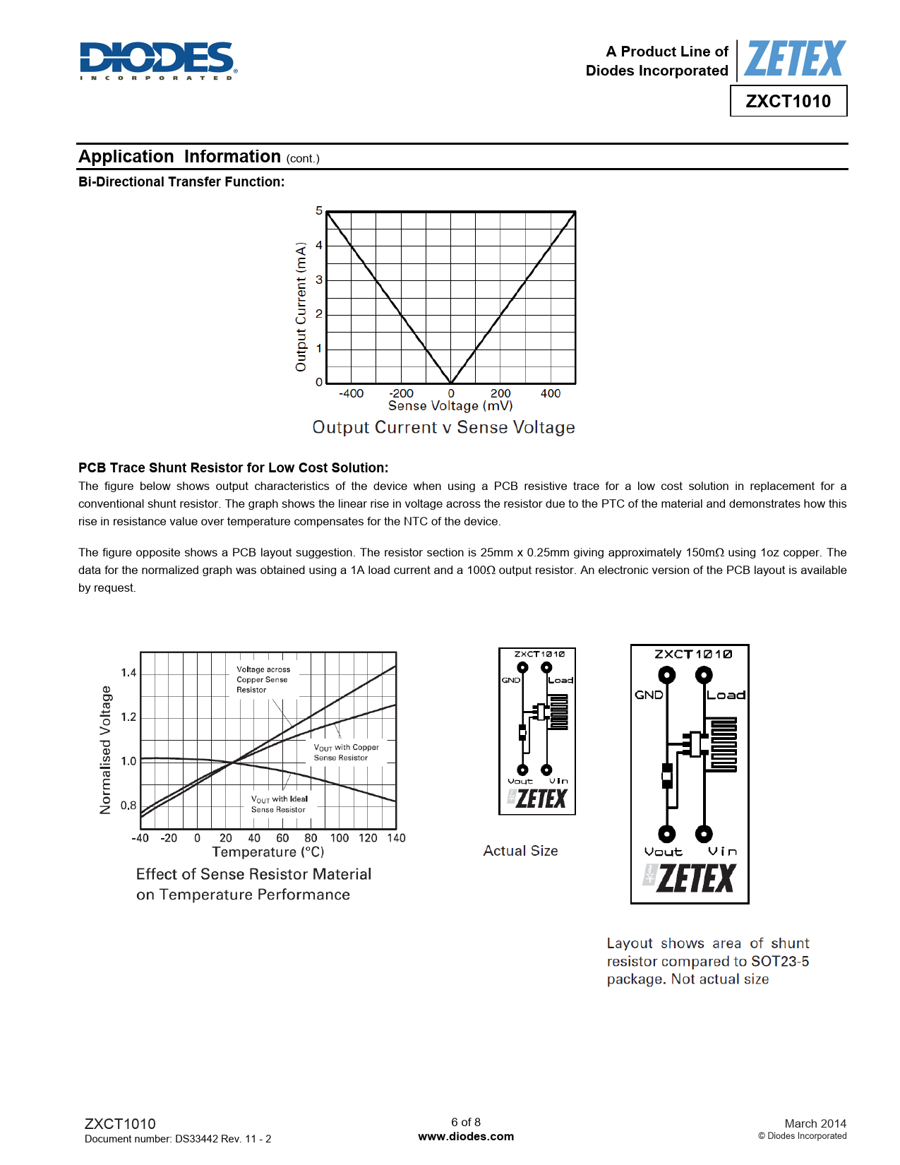 The figure below shows output characteristics of the device when using a PCB resistive trace for a low cost solution in replacement for a conventional shunt resistor. The graph shows the linear rise in voltage across the resistor due to the PTC of the material and demonstrates how this rise in resistance value over temperature compensates for the NTC of the device. The figure opposite shows a PCB layout suggestion. The resistor section is 25mm x 0.25mm giving approximately 150mΩ using 1oz copper. The data for the normalized graph was obtained using a 1A load current and a 100Ω output resistor. An electronic version of the PCB layout is available by request. ZXCT1010 6 of 8 March 2014 Document number: DS33442 Rev. 11 - 2