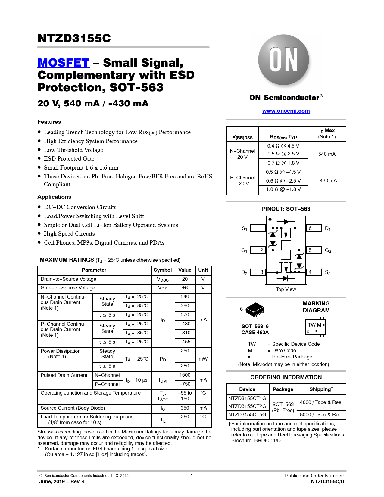 www.onsemi.com. Features. ID Max. (BR)DSS. RDS(on) Typ. Applications. PINOUT: SOT−563. MAXIMUM RATINGS. Parameter. Symbol. Value. Unit. MARKING