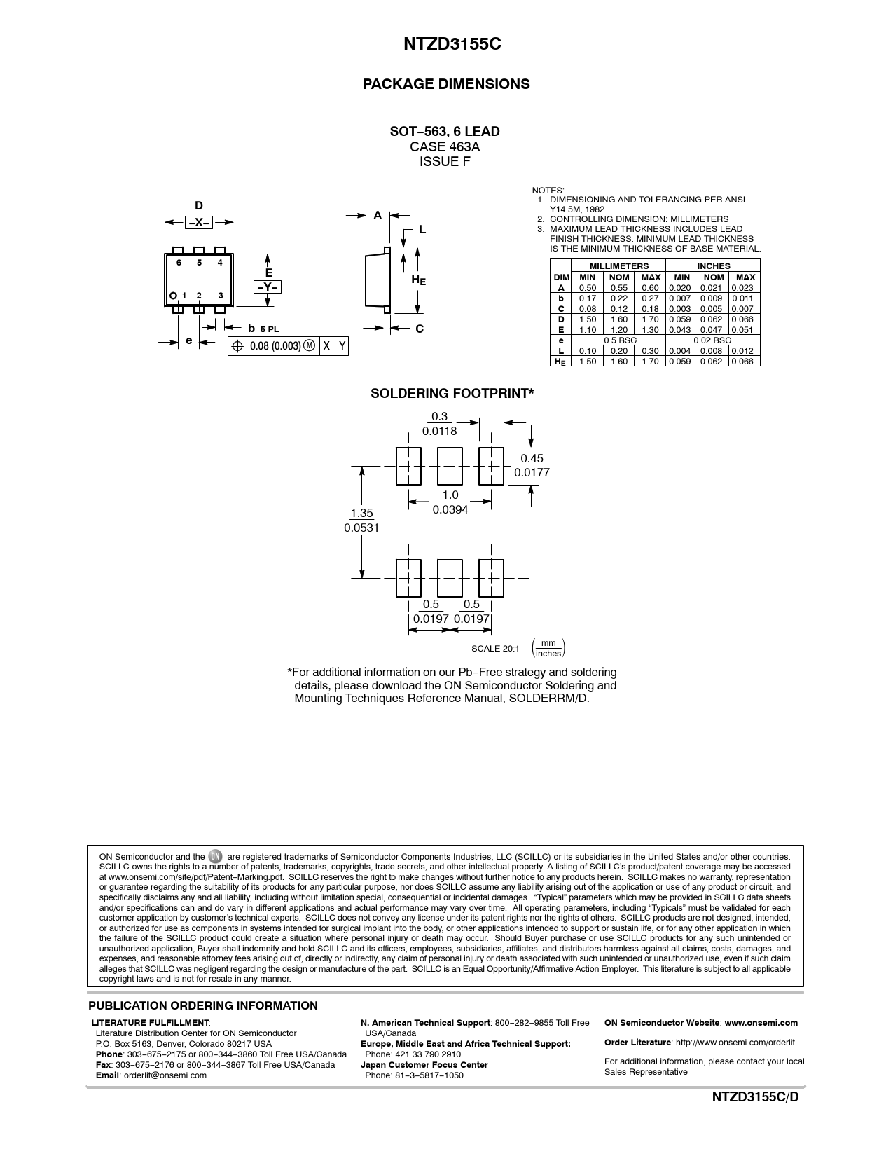 NTZD3155C PACKAGE DIMENSIONS SOT−563, 6 LEAD −X− MILLIMETERS INCHES DIM MIN NOM MAX MIN −Y− 1 2 b 6 5 PL SOLDERING FOOTPRINT*