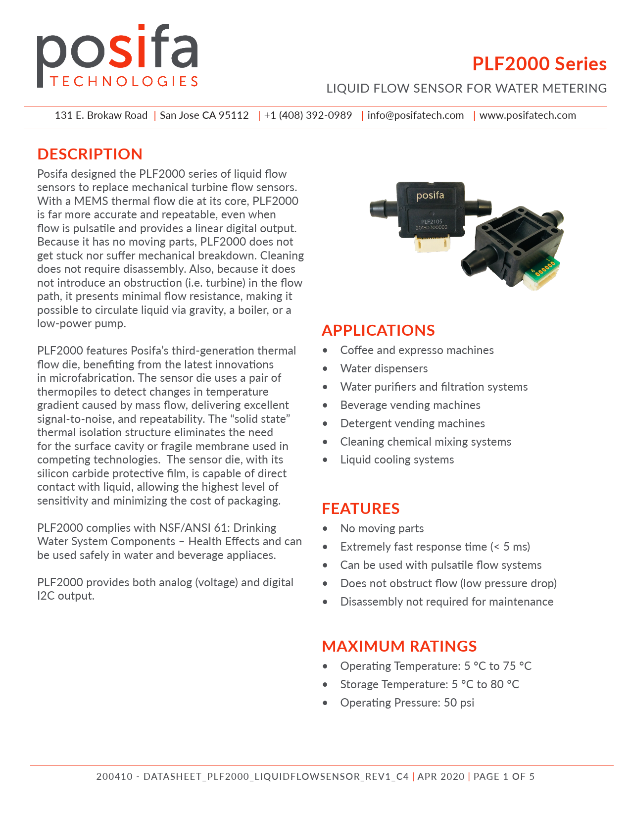 PLF2000 Series LIQUID FLOW SENSOR FOR WATER METERING 131 E. Brokaw Road | San Jose CA 95112 | +1 (408) 392-0989 | info@posifatech.com | www.posifatech.com DESCRIPTION Posifa designed the PLF2000 series of liquid flow sensors to replace mechanical turbine flow sensors. With a MEMS thermal flow die at its core, PLF2000 is far more accurate and repeatable, even when flow is pulsatile and provides a linear digital output. Because it has no moving parts, PLF2000 does not get stuck nor suffer mechanical breakdown. Cleaning does not require disassembly. Also, because it does not introduce an obstruction (i.e. turbine) in the flow path, it presents minimal flow resistance, making it possible to circulate liquid via gravity, a boiler, or a low-power pump. APPLICATIONS PLF2000 features Posifa’s third-generation thermal • Coffee and expresso machines flow die, benefiting from the latest innovations • Water dispensers in microfabrication. The sensor die uses a pair of thermopiles to detect changes in temperature • Water purifiers and filtration systems gradient caused by mass flow, delivering excellent • Beverage vending machines signal-to-noise, and repeatability. The “solid state” • Detergent vending machines thermal isolation structure eliminates the need for the surface cavity or fragile membrane used in • Cleaning chemical mixing systems competing technologies. The sensor die, with its • Liquid cooling systems silicon carbide protective film, is capable of direct contact with liquid, allowing the highest level of sensitivity and minimizing the cost of packaging. FEATURES PLF2000 complies with NSF/ANSI 61: Drinking • No moving parts Water System Components – Health Effects and can • Extremely fast response time (< 5 ms) be used safely in water and beverage appliaces. • Can be used with pulsatile flow systems PLF2000 provides both analog (voltage) and digital • Does not obstruct flow (low pressure drop) I2C output. • Disassembly not required for maintenance MAXIMUM RATINGS • Operating Temperature: 5 °C to 75 °C • Storage Temperature: 5 °C to 80 °C • Operating Pressure: 50 psi 200410 - Datasheet_PLF2000_LiquiDFLowsensor_rev1_C4 | aPr 2020 | PaGe 1 oF 5