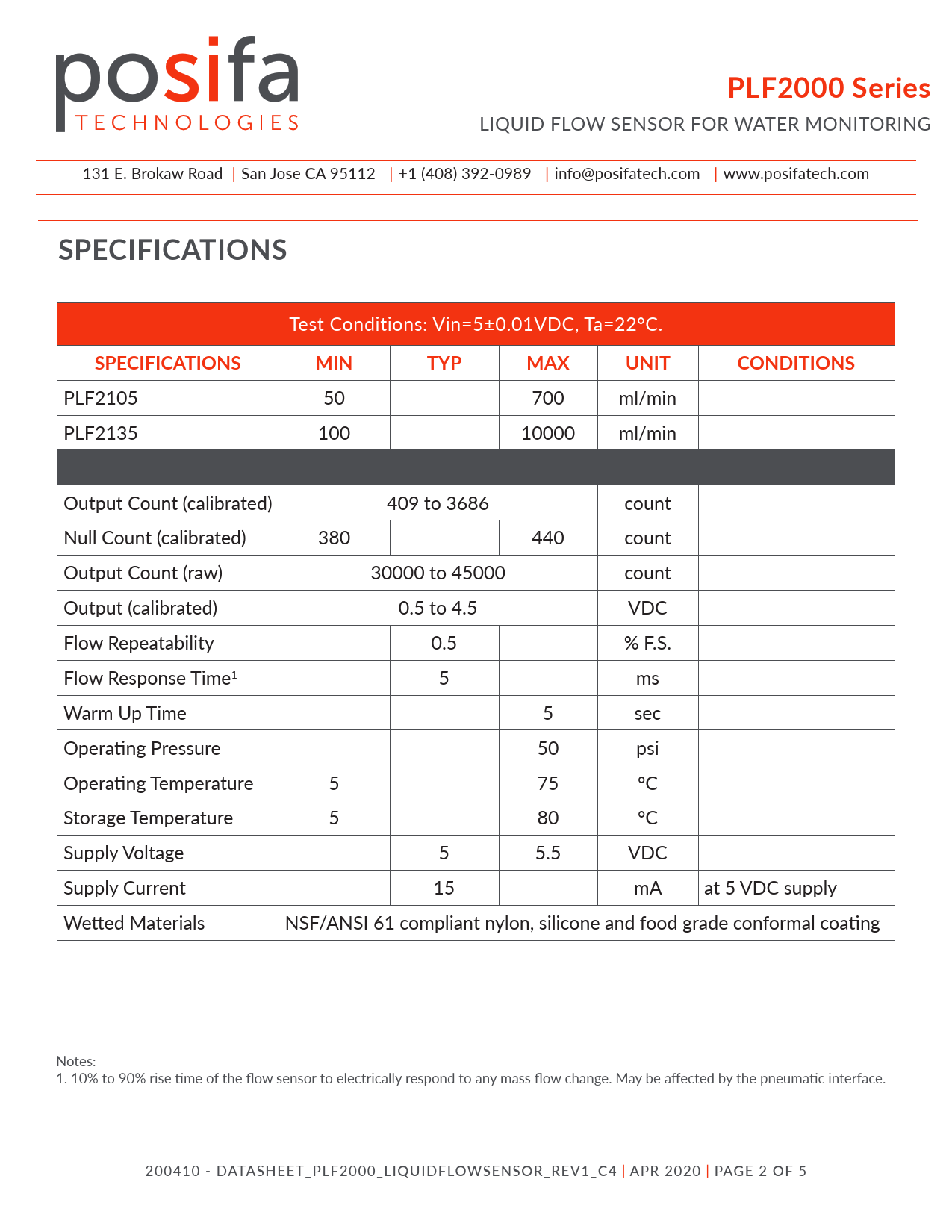 PLF2105 50 700 ml/min PLF2135 100 10000 ml/min Output Count (calibrated) 409 to 3686 count Null Count (calibrated) 380 440 count Output Count (raw) 30000 to 45000 count Output (calibrated) 0.5 to 4.5 VDC Flow Repeatability 0.5 % F.S. Flow Response Time1 5 ms Warm Up Time 5 sec Operating Pressure 50 psi Operating Temperature 5 75 °C Storage Temperature 5 80 °C Supply Voltage 5 5.5 VDC Supply Current 15 mA at 5 VDC supply Wetted Materials NSF/ANSI 61 compliant nylon, silicone and food grade conformal coating Notes: 1. 10% to 90% rise time of the flow sensor to electrically respond to any mass flow change. May be affected by the pneumatic interface. 200410 - Datasheet_PLF2000_LiquiDFLowsensor_rev1_C4 | aPr 2020 | PaGe 2 oF 5 131 e. BroKaw roaD | san Jose Ca 95112 | usa teL. +1-650-646-5788 www.PosiFateCh.CoM | eMaiL: inFo@PosiFateCh.CoM