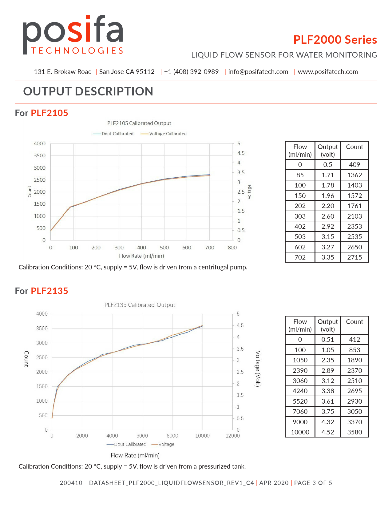 Flow Output Count (ml/min) (volt) 0 0.51 412 100 1.05 853 1050 2.35 1890 2390 2.89 2370 3060 3.12 2510 4240 3.38 2695 5520 3.61 2930 7060 3.75 3050 9000 4.32 3370 10000 4.52 3580 Calibration Conditions: 20 °C, supply = 5V, flow is driven from a pressurized tank. 200410 - Datasheet_PLF2000_LiquiDFLowsensor_rev1_C4 | aPr 2020 | PaGe 3 oF 5