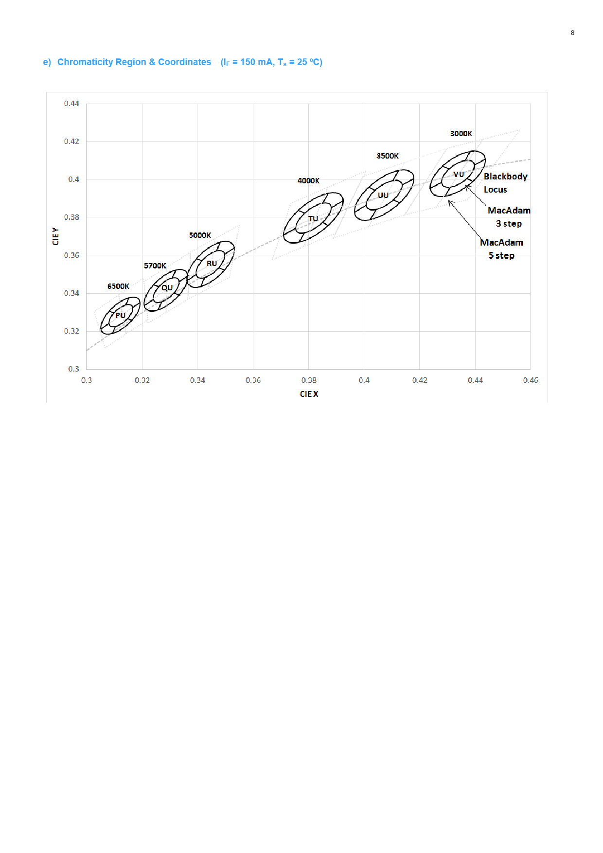 e) Chromaticity Region & Coordinates (IF = 150 mA, Ts = 25 ºC)