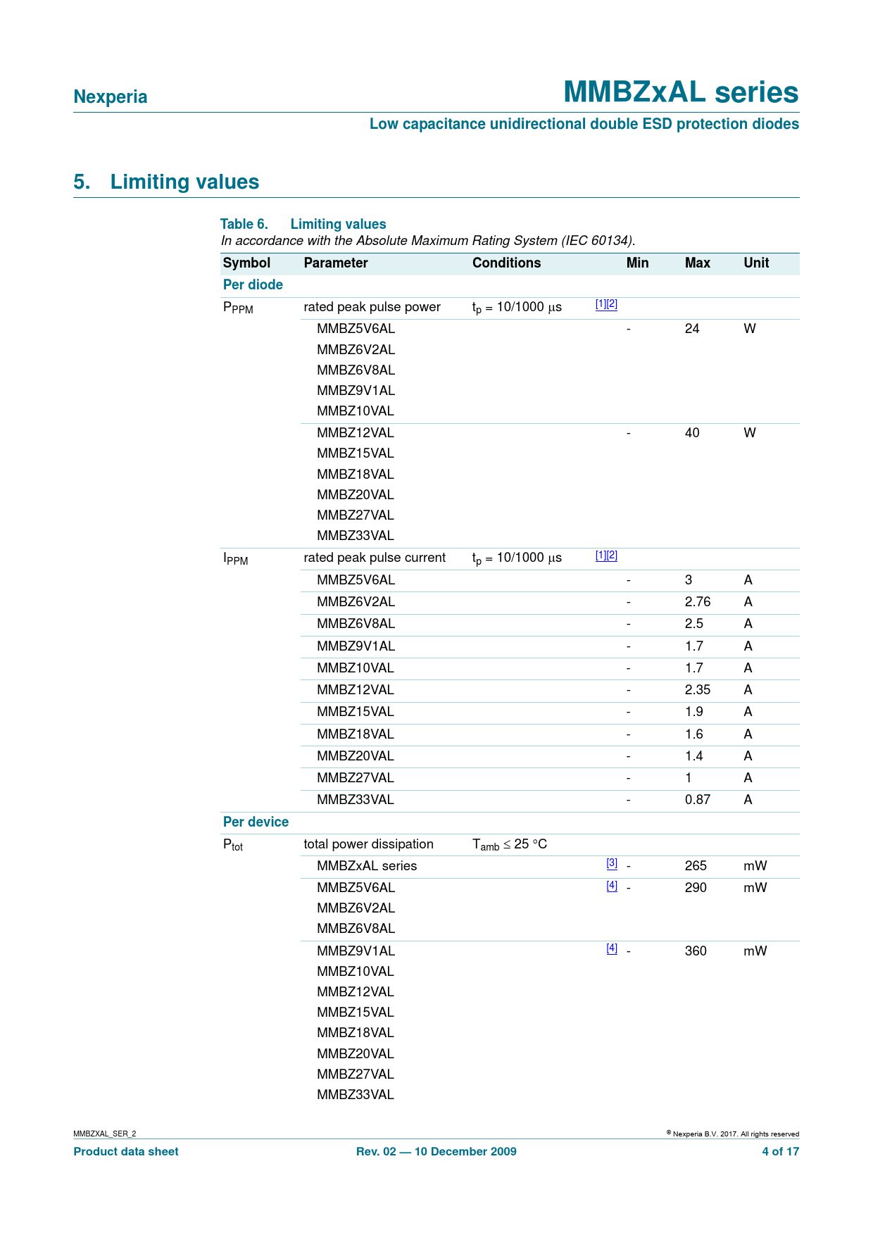 Nexperia. MMBZxAL series. Low capacitance unidirectional double ESD protection diodes. Limiting values. Table 6. Symbol. Parameter