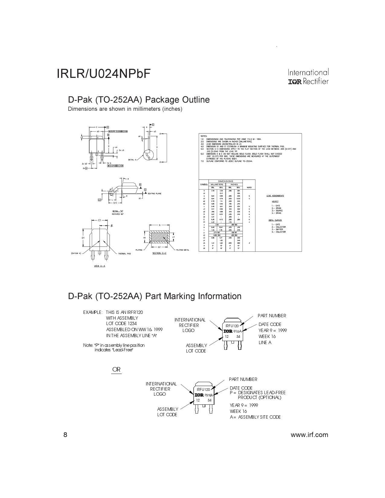 IRLR/U024NPbF D-Pak (TO-252AA) Package Outline Dimensions are shown in millimeters (inches) D-Pak (TO-252AA) Part Marking Information EXAMPLE: THIS IS AN IRFR120 WITH ASSEMBLY PART NUMBER INTERNATIONAL LOT CODE 1234 DATE CODE RECTIFIER IRFU120 ASSEMBLED ON WW 16, 1999 LOGO 916A YEAR 9 = 1999 IN THE ASSEMBLY LINE "A" 12 34 WEEK 16 LINE A Note: "P" in assembly line position ASSEMBLY indicates "Lead-Free" LOT CODE OR PART NUMBER INTERNATIONAL RECTIFIER DATE CODE IRFU120 P = DESIGNATES LEAD-FREE LOGO PRODUCT (OPTIONAL) 12 34 YEAR 9 = 1999 ASSEMBLY WEEK 16 LOT CODE A = ASSEMBLY SITE CODE 8 www.irf.com