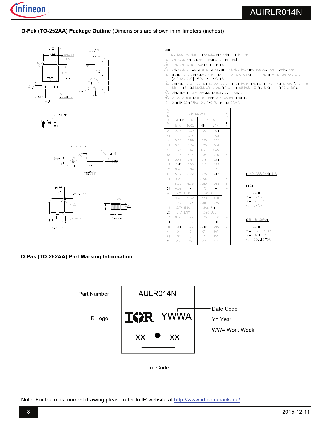 Part Number AULR014N Date Code IR Logo YWWA Y= Year WW= Work Week XX XX Lot Code Note: For the most current drawing please refer to IR website at http://www.irf.com/package/ 8 2015-12-11