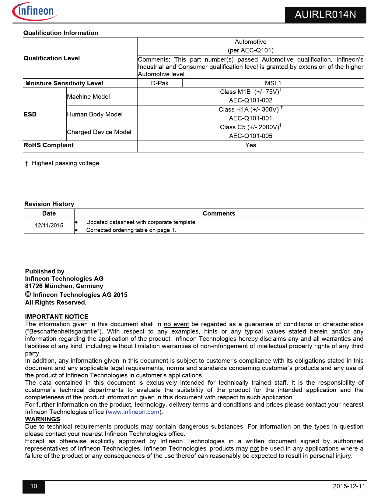Qualification Information. Qualification Level. Moisture Sensitivity Level. ESD. RoHS Compliant. Revision History. Date Comments