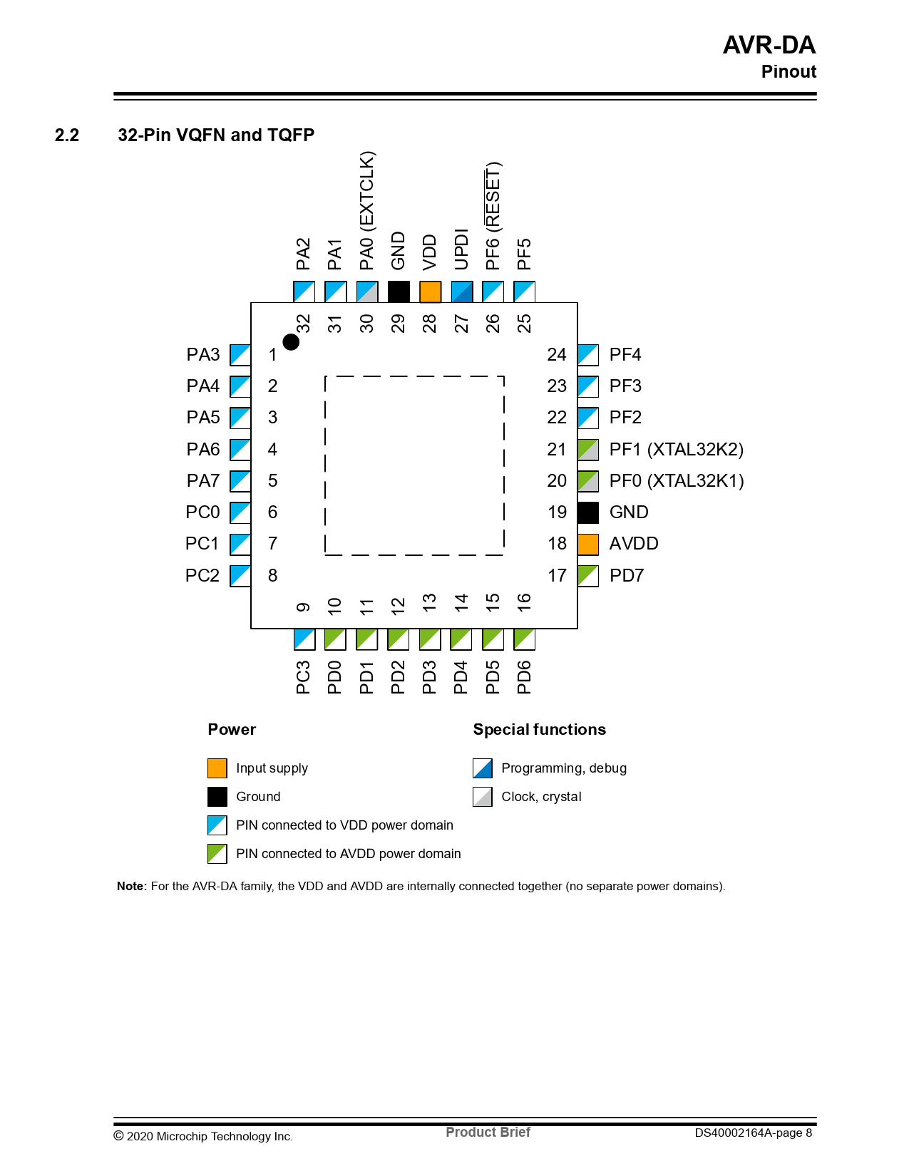AVR-DA. Pinout. 2.2. 32-Pin VQFN and TQFP. Power. Special functions. Note:. Product Brief