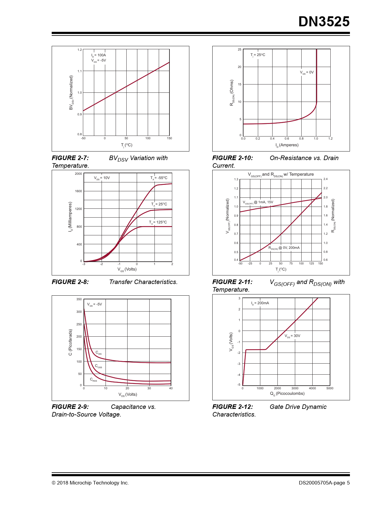 Gate Drive Dynamic Drain-to-Source Voltage. Characteristics. 2018 Microchip Technology Inc. DS20005705A-page 5 Document Outline 1.0 Electrical Characteristics 2.0 Typical Performance Curves FIGURE 2-1: Output Characteristics. FIGURE 2-2: Transconductance vs. Drain Current. FIGURE 2-3: Maximum Rated Safe Operating Area. FIGURE 2-4: Saturation Characteristics. FIGURE 2-5: Power Dissipation vs. Ambient Temperature. FIGURE 2-6: Thermal Response Characteristics. FIGURE 2-7: BVDSV Variation with Temperature. FIGURE 2-8: Transfer Characteristics. FIGURE 2-9: Capacitance vs. Drain-to-Source Voltage. FIGURE 2-10: On-Resistance vs. Drain Current. FIGURE 2-11: VGS(OFF) and RDS(ON) with Temperature. FIGURE 2-12: Gate Drive Dynamic Characteristics. 3.0 Pin Description TABLE 3-1: Pin Function Table 4.0 Functional Description FIGURE 4-1: Switching Waveforms and Test Circuit. TABLE 4-1: Product Summary 5.0 Packaging Information 5.1 Package Marking Information Information contained in this publication regarding device applications and the like is provided only for your convenience and may be superseded by updates. It is your responsibility to ensure that your application meets with your specifications. MIC... Trademarks The Microchip name and logo, the Microchip logo, AnyRate, AVR, AVR logo, AVR Freaks, BeaconThings, BitCloud, CryptoMemory, CryptoRF, dsPIC, FlashFlex, flexPWR, Heldo, JukeBlox, KeeLoq, KeeLoq logo, Kleer, LANCheck, LINK MD, maXStylus, maXTouch, Media... ClockWorks, The Embedded Control Solutions Company, EtherSynch, Hyper Speed Control, HyperLight Load, IntelliMOS, mTouch, Precision Edge, and Quiet-Wire are registered trademarks of Microchip Technology Incorporated in the U.S.A. Adjacent Key Suppression, AKS, Analog-for-the-Digital Age, Any Capacitor, AnyIn, AnyOut, BodyCom, chipKIT, chipKIT logo, CodeGuard, CryptoAuthentication, CryptoCompanion, CryptoController, dsPICDEM, dsPICDEM.net, Dynamic Average Matching, DAM, ECAN, ... SQTP is a service mark of Microchip Technology Incorporated in the U.S.A. Silicon Storage Technology is a registered trademark of Microchip Technology Inc. in other countries. GestIC is a registered trademark of Microchip Technology Germany II GmbH & Co. KG, a subsidiary of Microchip Technology Inc., in other countries. All other trademarks mentioned herein are property of their respective companies. © 2018, Microchip Technology Incorporated, All Rights Reserved. ISBN: 978-1-5224-3117-6 AMERICAS Corporate Office Atlanta Austin, TX Boston Chicago Dallas Detroit Houston, TX Indianapolis Los Angeles Raleigh, NC New York, NY San Jose, CA Canada - Toronto ASIA/PACIFIC Australia - Sydney China - Beijing China - Chengdu China - Chongqing China - Dongguan China - Guangzhou China - Hangzhou China - Hong Kong SAR China - Nanjing China - Qingdao China - Shanghai China - Shenyang China - Shenzhen China - Suzhou China - Wuhan China - Xian China - Xiamen China - Zhuhai ASIA/PACIFIC India - Bangalore India - New Delhi India - Pune Japan - Osaka Japan - Tokyo Korea - Daegu Korea - Seoul Malaysia - Kuala Lumpur Malaysia - Penang Philippines - Manila Singapore Taiwan - Hsin Chu Taiwan - Kaohsiung Taiwan - Taipei Thailand - Bangkok Vietnam - Ho Chi Minh EUROPE Austria - Wels Denmark - Copenhagen Finland - Espoo France - Paris Germany - Garching Germany - Haan Germany - Heilbronn Germany - Karlsruhe Germany - Munich Germany - Rosenheim Israel - Ra’anana Italy - Milan Italy - Padova Netherlands - Drunen Norway - Trondheim Poland - Warsaw Romania - Bucharest Spain - Madrid Sweden - Gothenberg Sweden - Stockholm UK - Wokingham