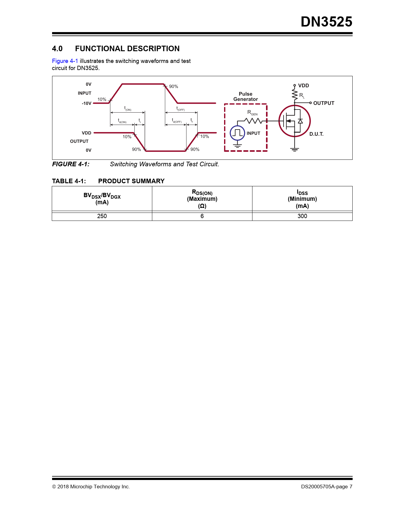 DN3525. 4.0. FUNCTIONAL DESCRIPTION. VDD. INPUT. Pulse. Generator. -10V. OUTPUT. D.U.T. FIGURE 4-1:. TABLE 4-1:. PRODUCT SUMMARY. DS(ON). DSS