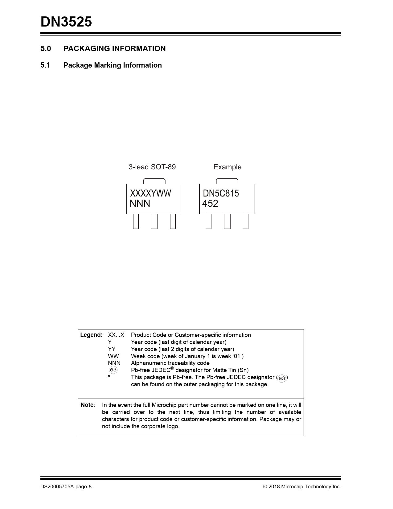 DN3525. 5.0. PACKAGING INFORMATION. 5.1. Package Marking Information. Legend:. Note